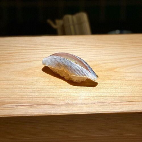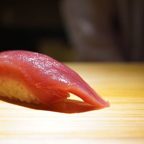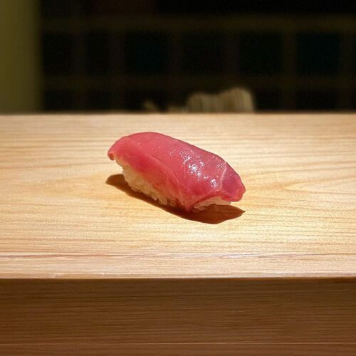 From the outset, the chef resolved to create an old school sushi restaurant. The no-nonsense shop name, the big, bold sign and the wooden menu board hung on the wall all hark back to the sushi shops of old. The sloping counter with a groove along one side prevents soy sauce spillage—an idea from his mentor. Sushi rice is slightly sour and generously portioned, toppings thick, like in the good old days. Tuna, as a star topping, is served with great care in sets of three nigiri.