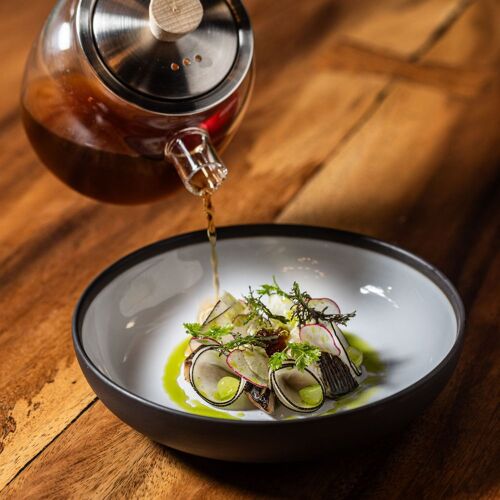A ‘bacôve’ is a large flat-bottomed boat used by the vegetable growers of the marshes of St Omer to transport their crops. It is emblematic of Camille Delcroix’ inspiration (Top Chef 2018 winner) and of his soothing, nature-inspired restaurant. He crafts razor-sharp menus, inspired by first-rate locally sourced produce in a surf ‘n turf vein. The chef’s preoccupation with presentation shines through, both in the choice of tableware as in the colours and graphics of each plate. Finally, Carla and her smiling team bend over backwards to make you feel at home.