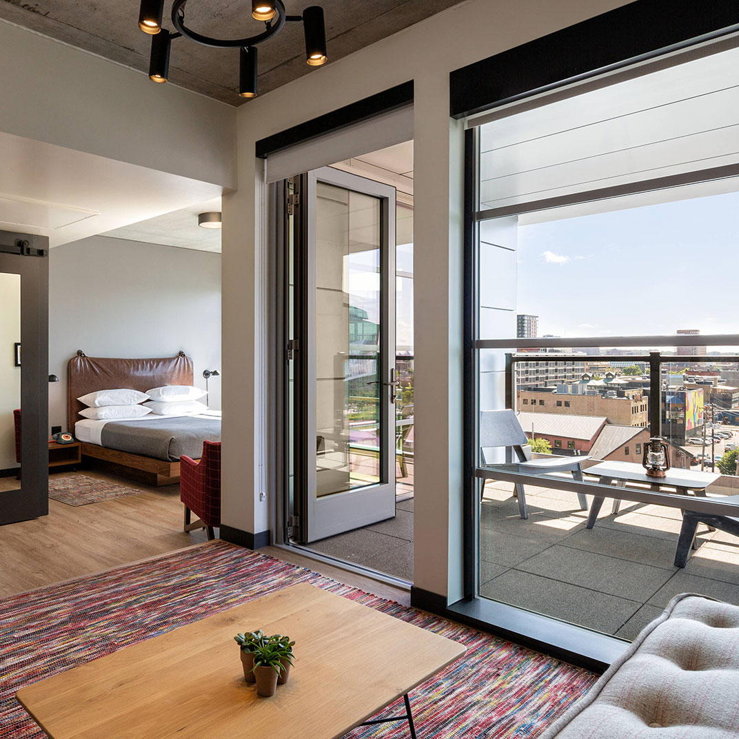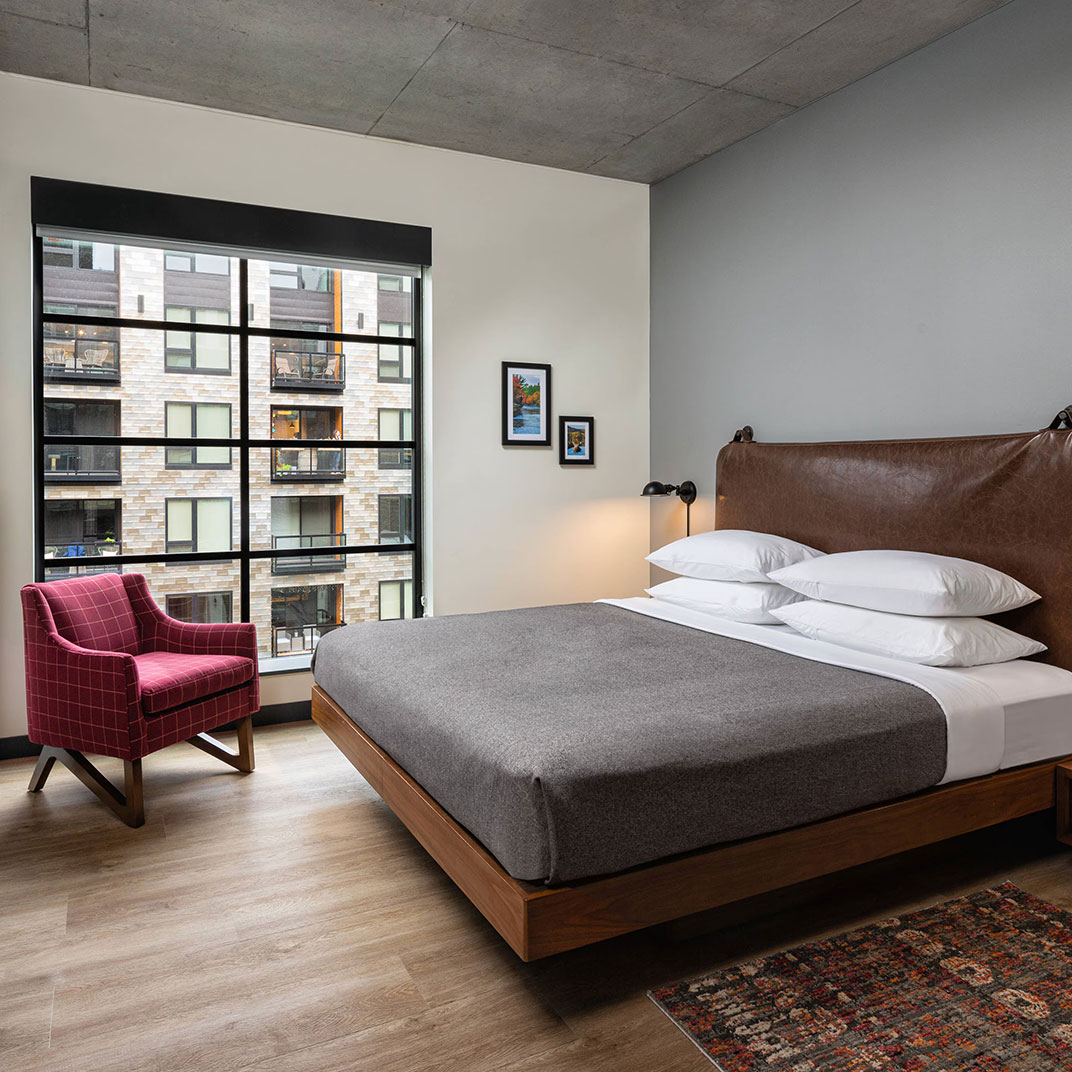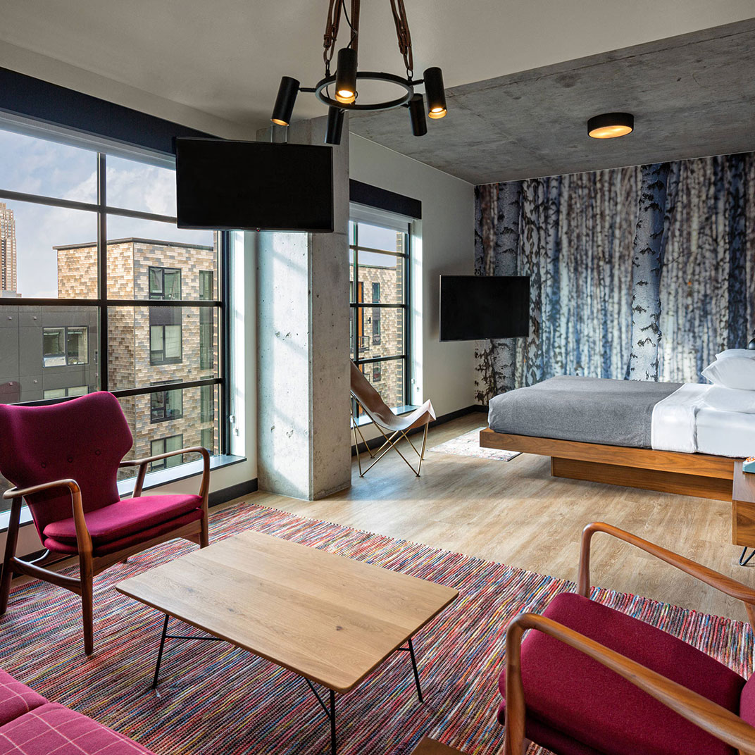 In a city that knows how to stay out late, Moxy Minneapolis Downtown delivers the right kind of energy. Located across from the stadium and minutes from the river, this hotel knows its crowd: quick check-ins at the bar, all-day gathering spots, and rooms designed for recharge, not retreat. Expect LED mood lighting, large-scale local art, and all the streaming you can handle. The gym is 24/7, the vibe skews irreverent, and the cocktails are mixed with intent. If your idea of travel comes with a soundtrack, this place plays it loud.