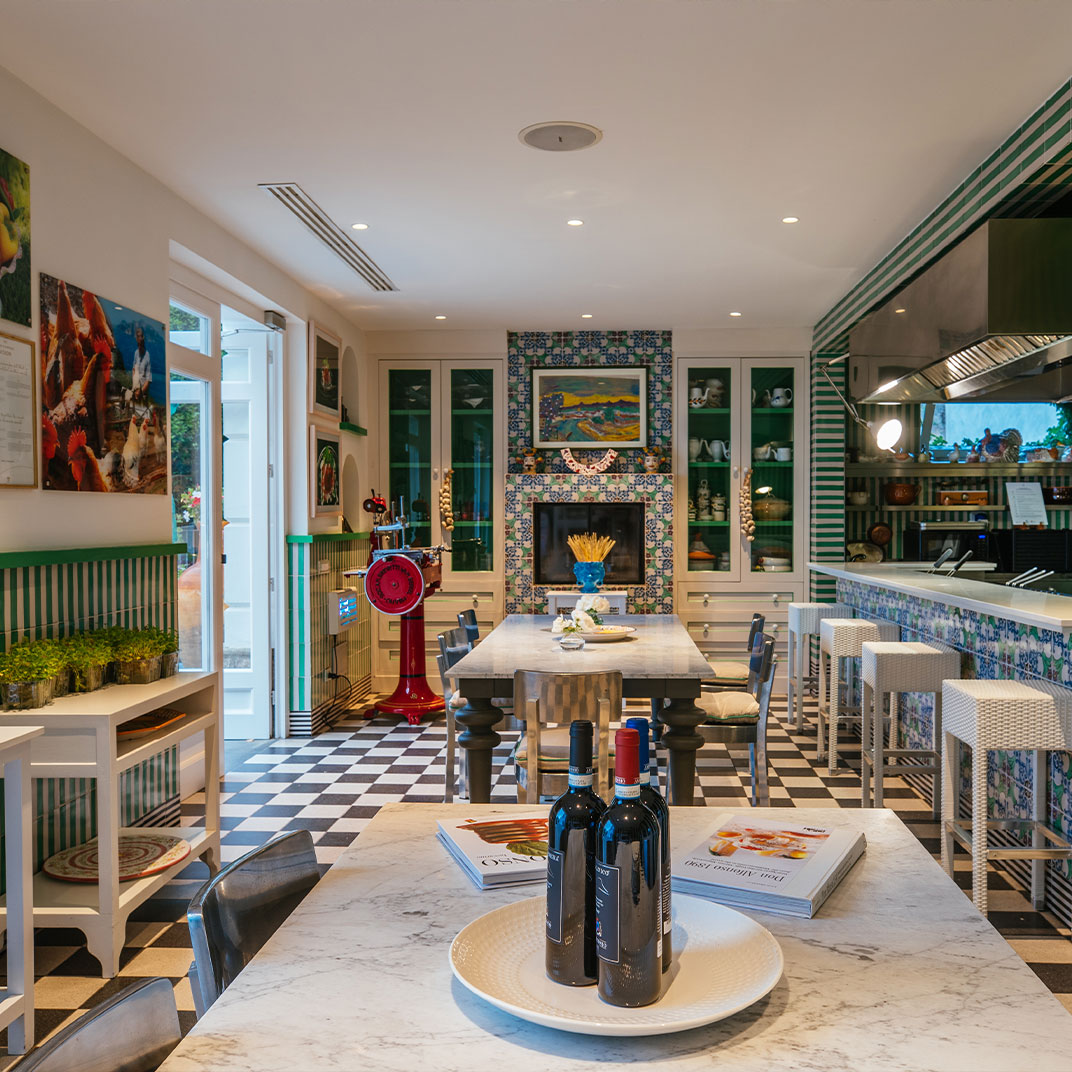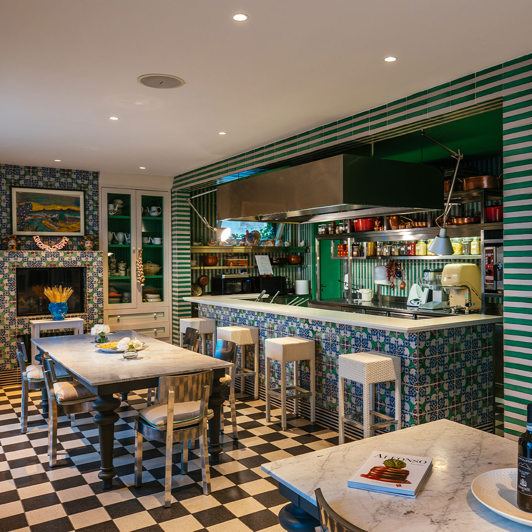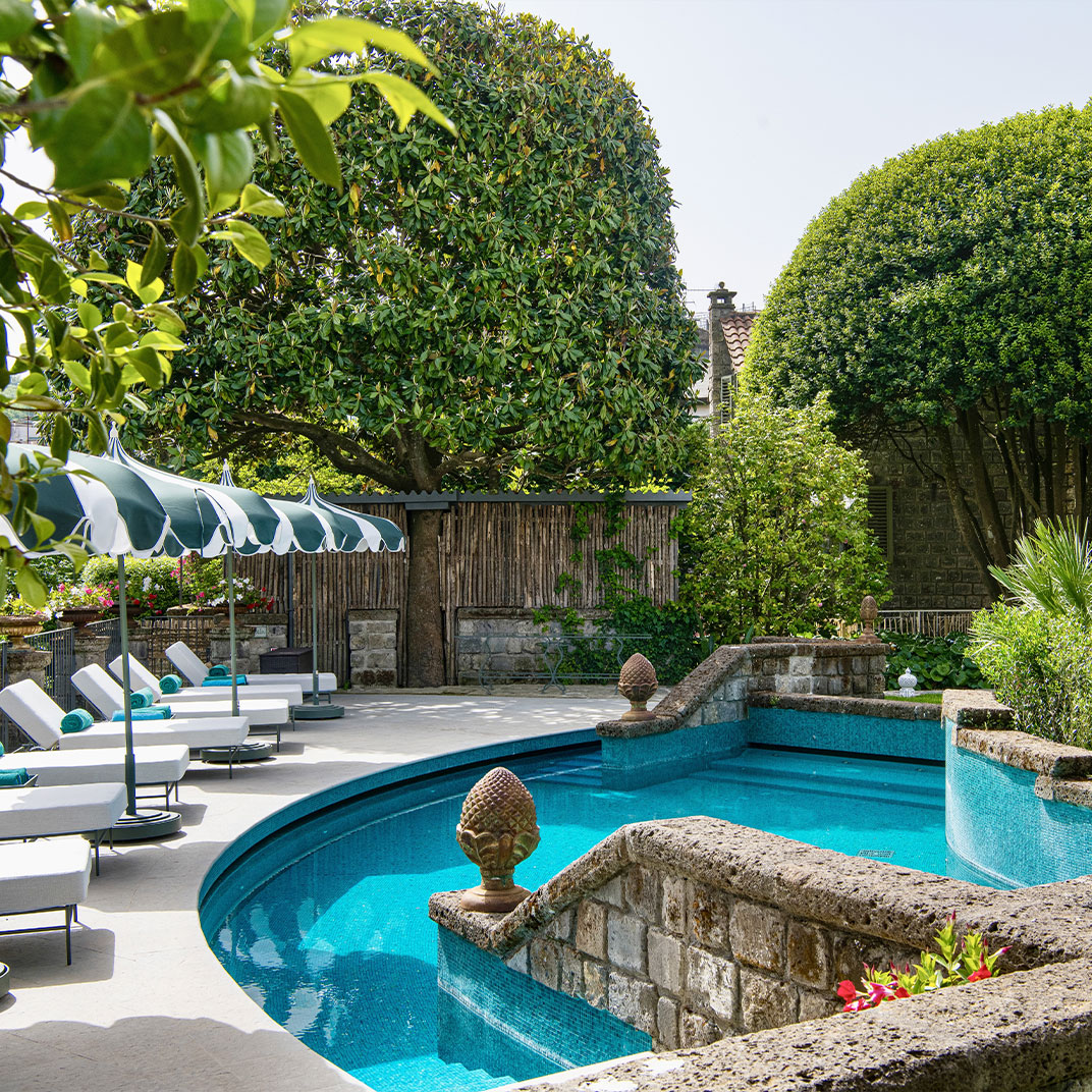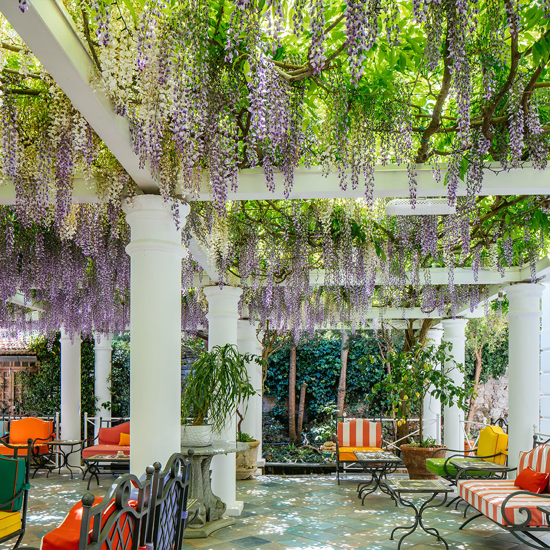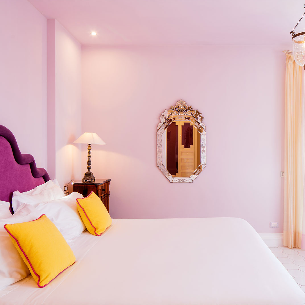 While the menu at Don Alfonso 1890’s two-Michelin-star restaurant may be more or less what you expect, given its setting just inland from the Amalfi Coast, it’s safe to say the interior design probably isn’t. This renovated 19th-century house, in Sant’Agata sue Due Golfi on the Sorrentine peninsula, has traditional elements, but the fanciful color scheme — rose, magenta, and bubble-gum pink, with accents in canary yellow, lime green and cherry red — feels straight out of Alice in Wonderland. Guest rooms are charming and cheerful, with vaulted ceilings, locally made artwork, and hand-painted mosaics. Outside, a wide covered porch twinkles with tiny lights after dark; relax with drinks after a cooking class or a tour of the wine cellar and cheese aging room, located in a pre-Roman tunnel.