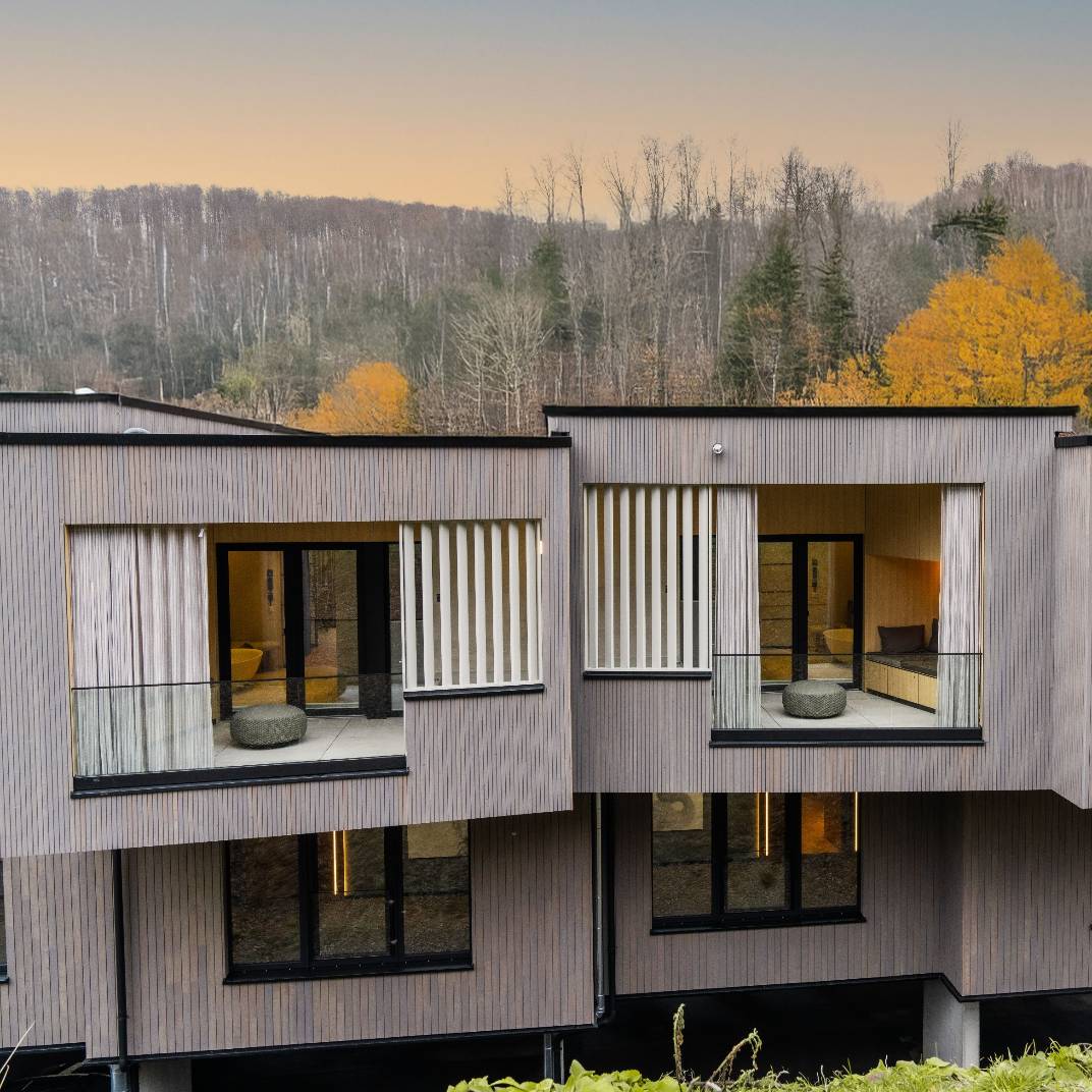 Some rooms in the main building are modern and sleek with monochromatic murals, white marble bathrooms, and panoramic windows facing the treetops, while others, like the charmingly wood-paneled tower room or the cozy attic suite in the restored coachman’s house next door, have historic character. Sustainably built two-story spa suites, each one with its own Finnish sauna and open-air whirlpool tub, offer extra space and privacy. Breakfast is served in the light-filled restaurant, and self-guided mountain biking itineraries leave right from the front door.