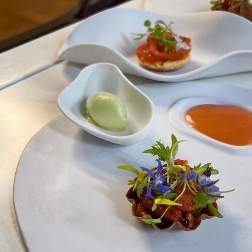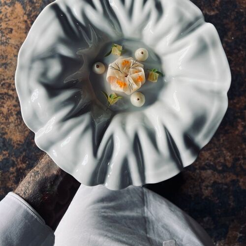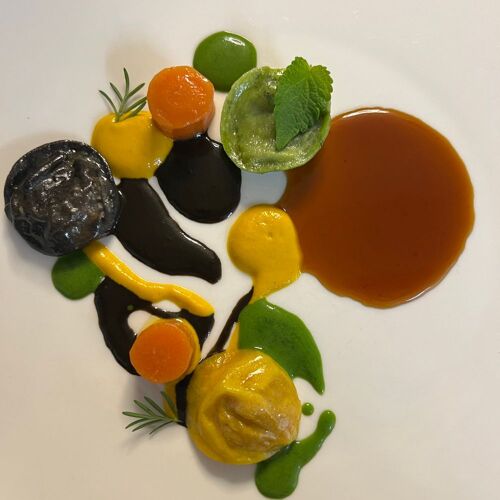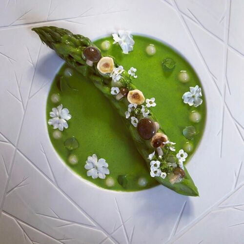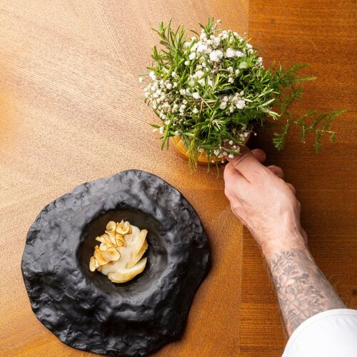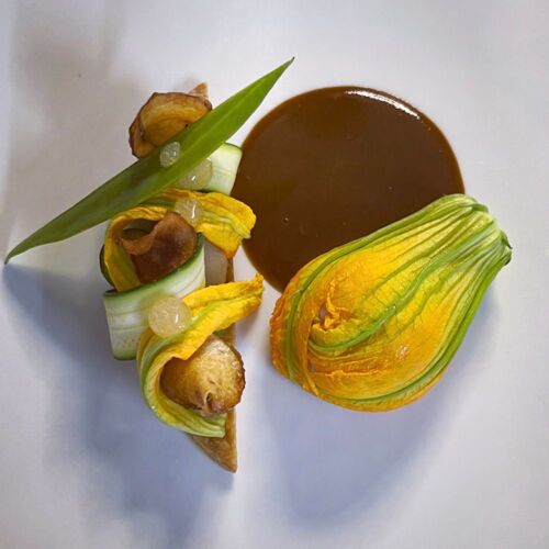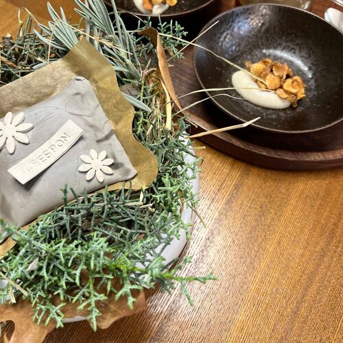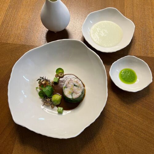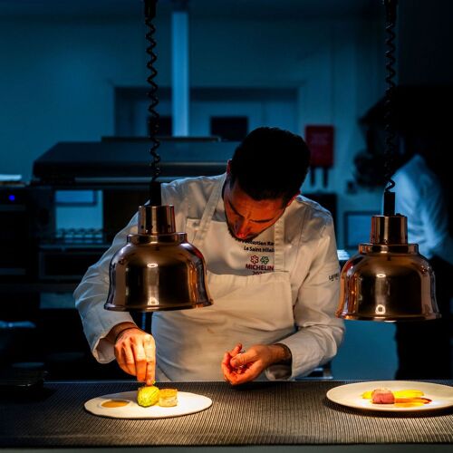 "At Le Saint Hilaire, there is no fixed menu, simply a choice between two surprise offerings, which showcase the best local and seasonal produce. Fish from the Grau-du-Roi, trout from Fumades, free range pork from the Cévennes, veal and lamb from Lozère, pigeon from Costières, wild herbs... And in the dining room, the knives are artisan-forged, the tableware is produced by a potter in Alès and the jeans worn by the staff are made in Florac."