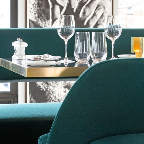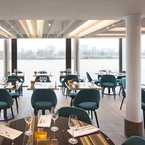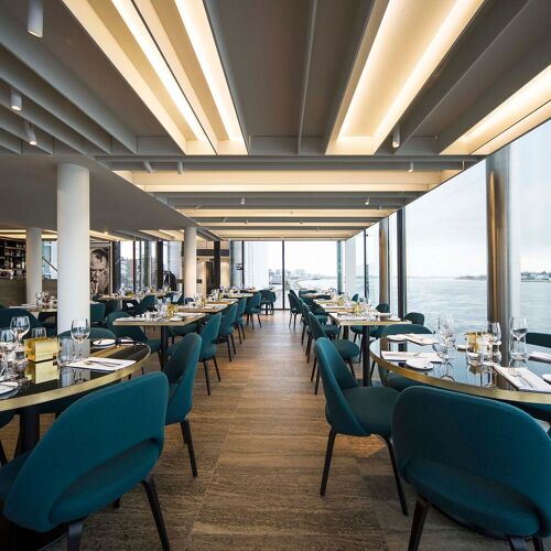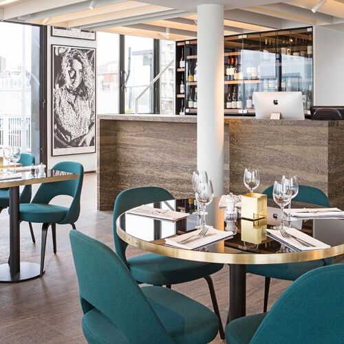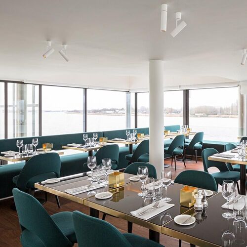 The view of the Scheldt River and the docks makes this restaurant's terrace one of the finest in Antwerp! Thanks to all the windows, the water feels omnipresent, even if you are seated inside. Charcoal sketches by Rinus Van de Velde lend an arty feel to the sleek interior. The extensive menu is dominated by traditional favourites. The fried sole is an obvious classic, but for something truly special, try the crispy veal sweetbreads in a brown stock and port sauce. The generous portions certainly go down well. And for those in a hurry, a quick lunch is always available, too.