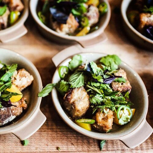 Highlights include pan-seared dumplings with tender guinea hen and shiitake mushrooms accompanied by a tableside pour of umami-rich broth. Heartier plates of fried black cod tail glazed in a delicious tamari-butter, followed by hot-pink rhubarb-and-passion fruit granita over an oat mousse are a fine study in wonderfully unexpected flavors and textures.