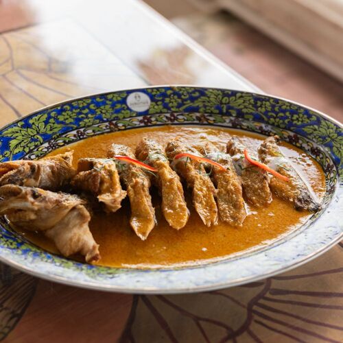 Situated in a pleasant, cool, and shady location, the riverside offers seating in small Thai pavilions and boasts views of a golden pagoda. The space is decorated in traditional Thai style, in keeping with the cuisine, which features intense local flavours. Try the sour soup with fresh chilli and squid, and the aromatic, flavoursome fried river fish in chu chi curry. Round off your meal with classic Thai desserts made with fresh coconut milk.