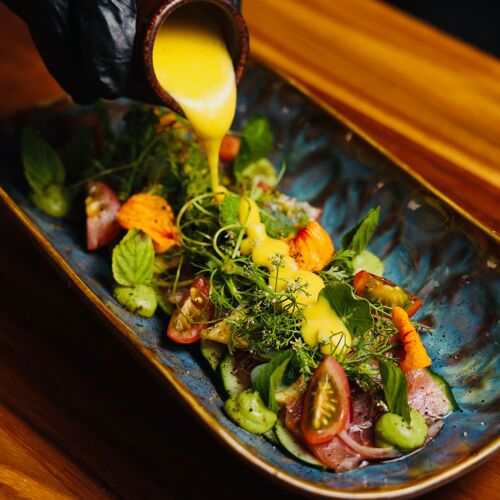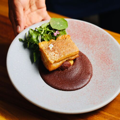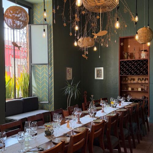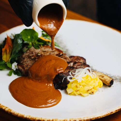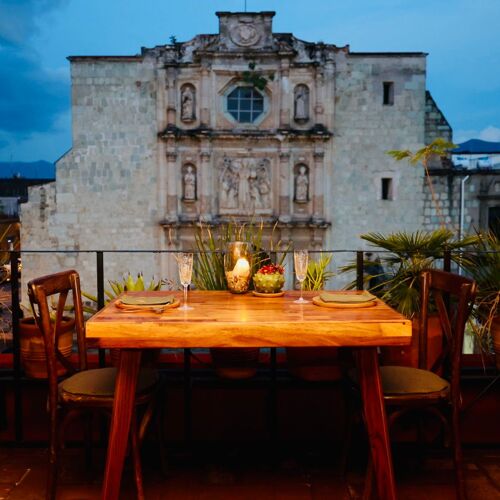 With its terraced setting overlooking a church in the center of the city, Brio looks and feels very Oaxacan. It's fitting, then, that the menu echoes the tribute to the region with its focus on local dishes and ingredients given a hint of Mediterranean flair. The wood-fired grill is the centerpiece, with all proteins kissed by the flames. Begin with an appetizer such as the roasted beet salad set atop chile de agua cream sauce and chamomile honey alongside sliced tomatoes and apples. Then, bone-in pork chop benefits from the wood fire, but the peanut mole is the last word. Crème brûlée is given a twist here, infused with poleo for a brightness not often seen.