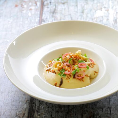 The frontage decked in Corten (steel with a rusty appearance) is part of a beautiful stone façade, located on the town's ring road. In the kitchen, the chef produces inspired, delicious and indulgent dishes. Organic Scottish salmon gravlax, avocado and samphire tacos, sour cream; thick pollack steak confit in olive oil, frothy aioli and steamed vegetables; melt-in-the-mouth apple on a soft Breton palet biscuit, vanilla mousseline cream. Dishes of great finesse that go down a treat!