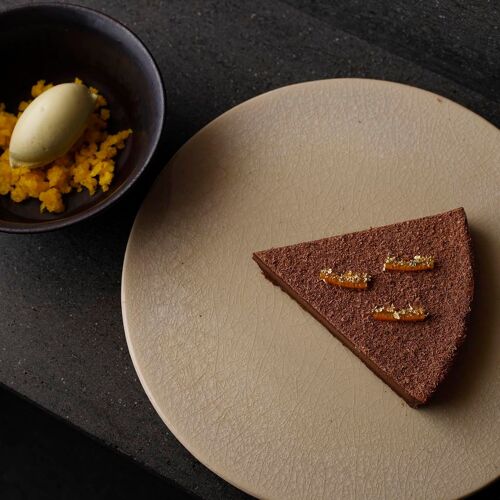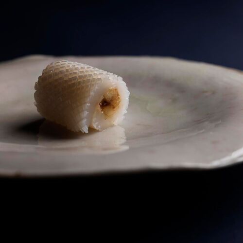 The French-born chef was studying the cuisine of his native land when he became interested in Japanese food culture. To learn Japanese techniques and culture, he apprenticed at a Kyoto ryotei. The first half of his prix fixe offering includes Japanese inspirations such as sushi roll. In the latter half, he switches gears to offer French cuisine, paying meticulous attention to the sauces that are its soul. The chef expresses the path he has trodden in both countries with flair and imagination. It begins with Japanese and ends with French.