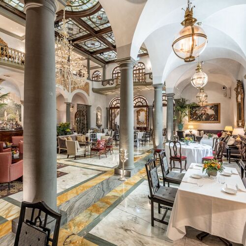 Horse-drawn carriages once entered the old courtyard of the St Regis hotel, now converted into an elegant winter garden which also includes a cocktail bar with sofas and armchairs. Seasonality and local gems are fundamental pillars of the modern Mediterranean cuisine.