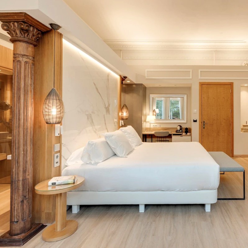 Contrairement à la plupart des établissements de luxe de Barcelone, l’Hotel Mirlo Barcelona ne se trouve pas au centre-ville. « Mirlo » signifie « merle » en espagnol : l’idée est que les clients partent explorer de jour la cité, à vingt minutes en voiture ou en métro, et rentrent au nid quand ils en ont envie. Outre son écrin de verdure et la tranquillité des lieux, ce majestueux hôtel aux airs de villa possède des suites dont le romantisme assumé ne renie en rien la modernité, chacune d’entre elles disposant d’un spa privatif (pouvant comprendre un hammam, un bain à remous, un ciel de pluie, une baignoire balnéo ou un sauna, voire, dans le cas de la suite Mirlo, une combinaison de toutes ces prestations). Les endroits où se détendre abondent : les jardins luxuriants, la piscine sise dans une cour où règne une douce tranquillité, la bibliothèque au confort douillet ou encore le restaurant et le bar baignés de lumière qui mêlent habilement intérieur et extérieur. Revers de la médaille, l’attraction des lieux est si forte qu’il n’est pas évident de réunir l’énergie permettant de s’élancer vers la ville. Heureusement, le parc Güell est à dix minutes en voiture.