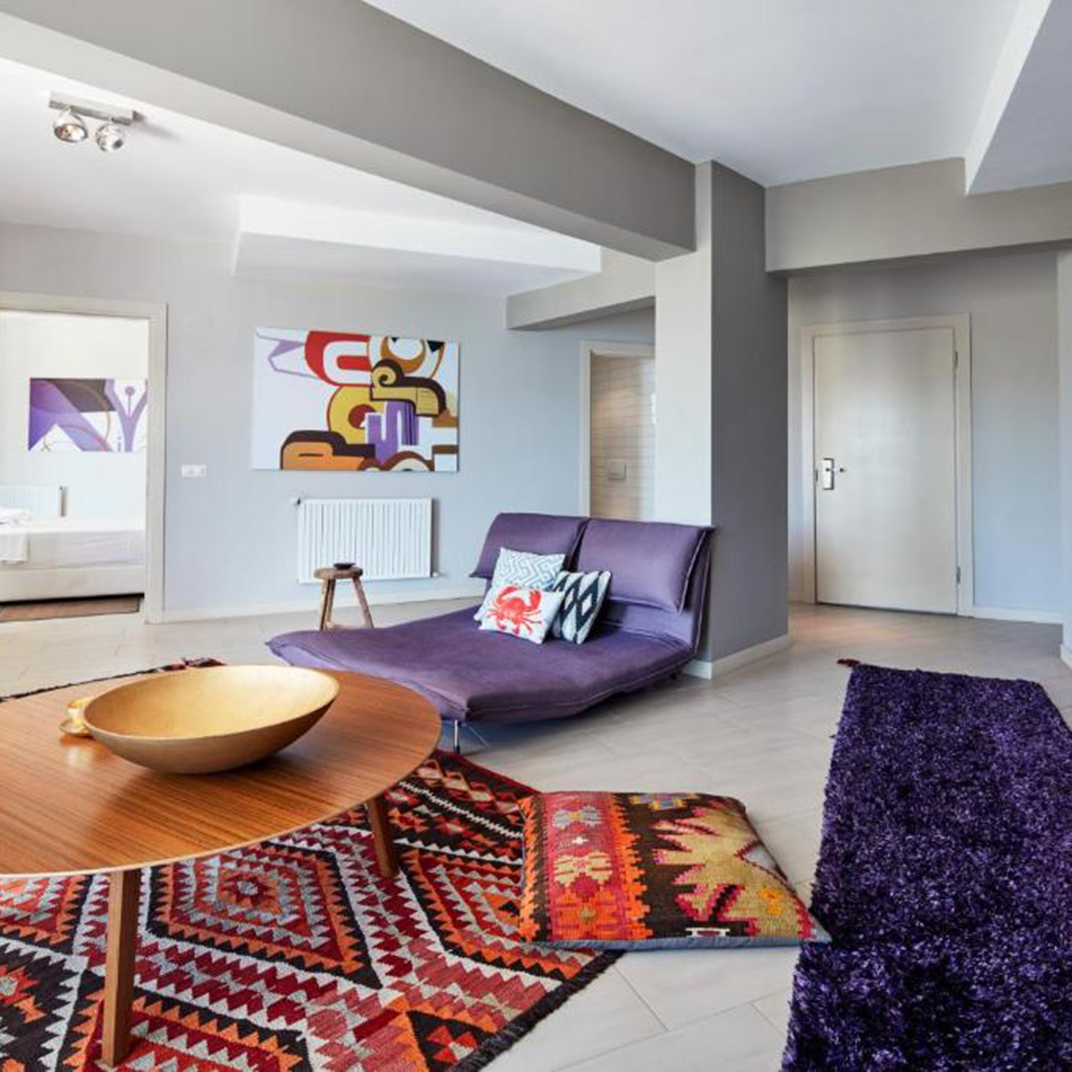 Esthétiquement, l’hôtel s’inspire de la partie européenne de la Turquie, avec un mobilier clair et moderne, qu’on imaginerait aisément sur le plateau d'un film italien des années 70. La palette de couleurs change selon le thème de la pièce, allant de teintes cannelle et bronze à des rouges vibrant. En plus de balcons privés, les vingt-six suites du Med-Inn offrent les mêmes équipements - connexion Wi-Fi, téléviseurs à écran plat - mais diffèrent considérablement en taille, les huit grandes suites étant à peu près deux fois plus grandes que les junior.
