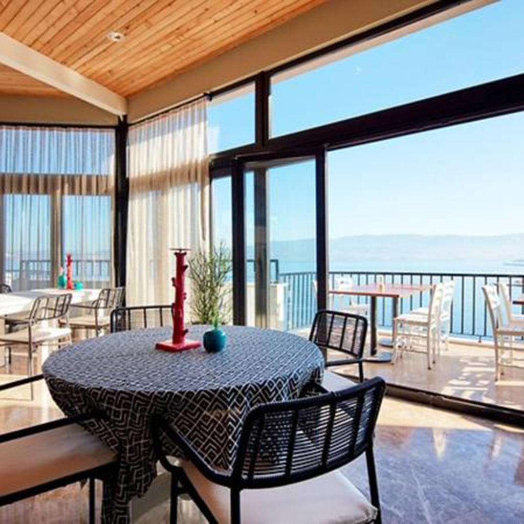 L’atmosphère paisible et reposante du Med-Inn est assurée par la proximité de la plage et les vues dégagées sur la baie depuis presque n’importe quel point de vue de l'hôtel. Cela vaut aussi pour le bar lounge, installé dans un jardin privé donnant sur la piscine extérieure. Pour une cuisine plus substantielle, les clients ne sont heureusement pas séquestrés à l’intérieur : l'étage supérieur est entièrement consacré à un restaurant — avec vue sur la mer, bien entendu.