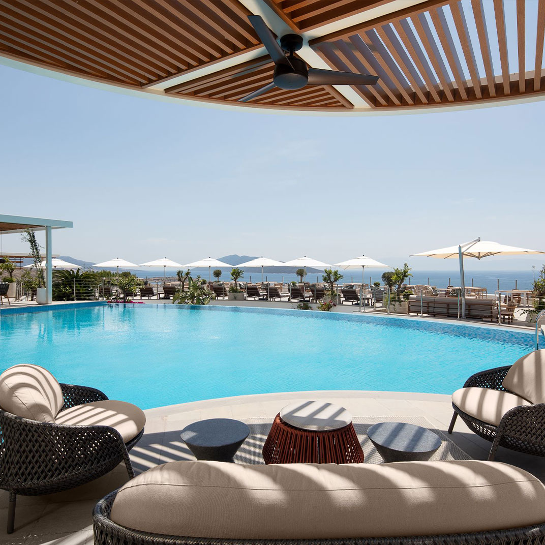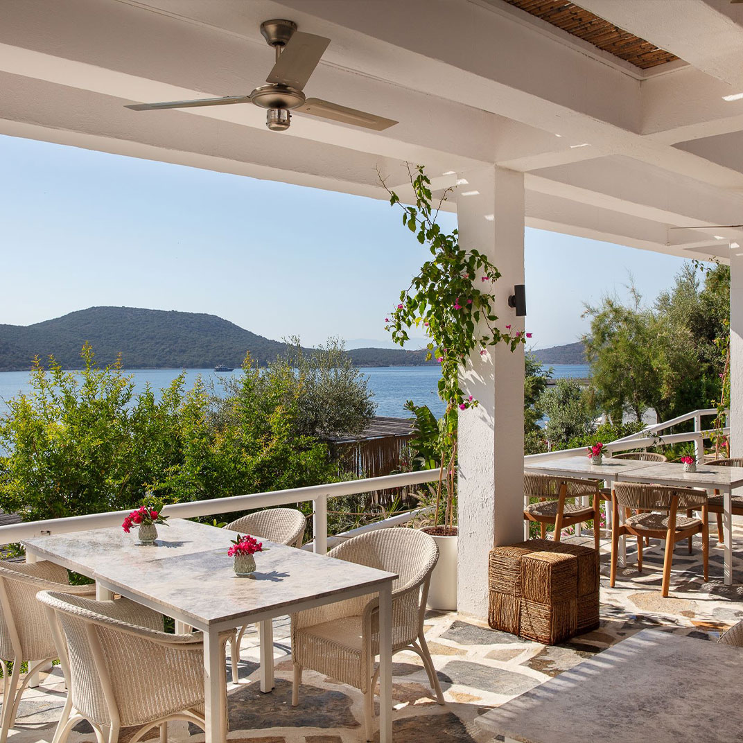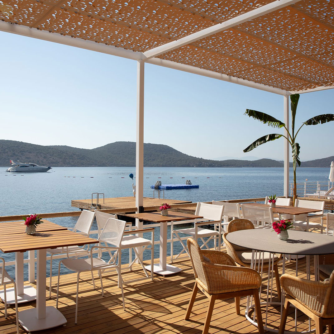 C’est le parti pris par le Doria Hotel, élégant resort contemporain juché sur un promontoire, offrant de superbes vues sur la mer, propice ici à la plongée ou au snorkeling — même si vous y trouverez sûrement moins d’amphores qu’au Musée d’Archéologie sous-marine de Bodrum. Comme l’ensemble du bâtiment, les chambres y sont modernes et dépouillées, avec des jalousies et des voilages blancs, des têtes de lit lazurées et des tableaux colorés. Elles sont réparties autour d’un immense atrium, où logent des salons accueillants, un bar et le restaurant Blu, dont le design affiche déjà une petite note africaine.