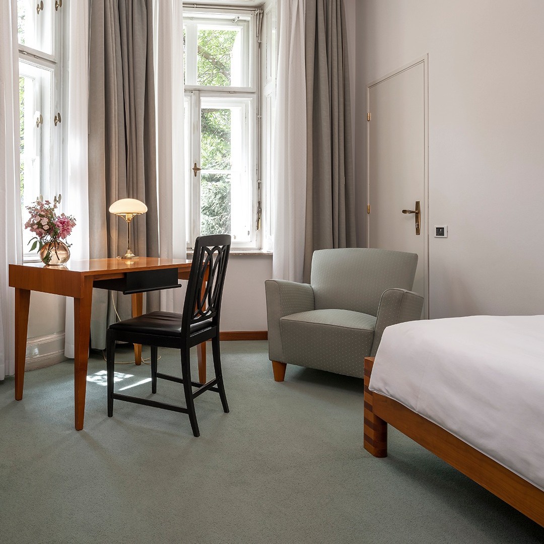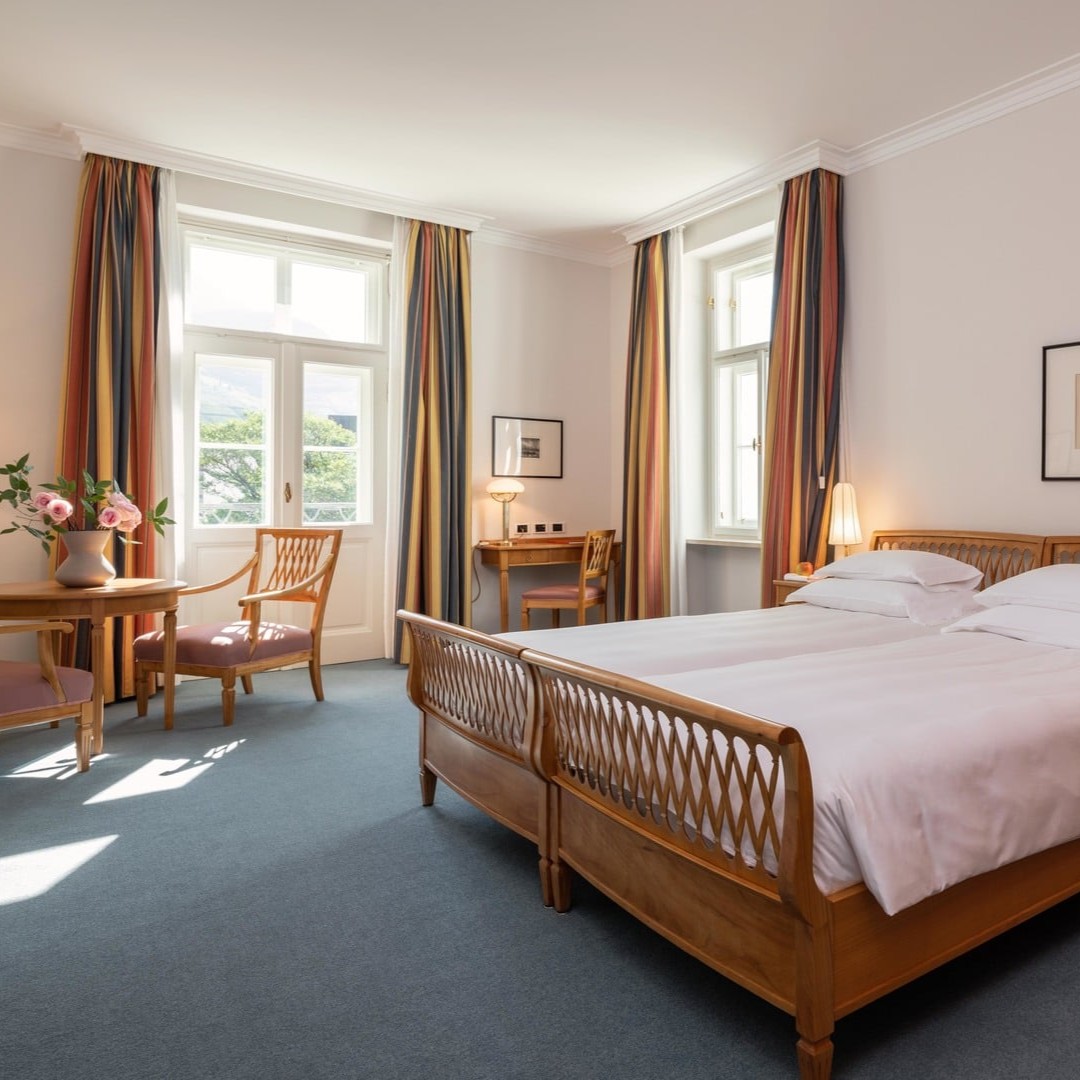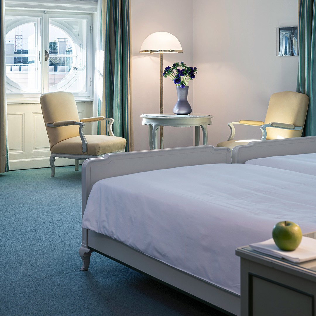 Nor are the rooms and suites the whole story, in this or any other grand hotel. The hotel’s park and gardens are a fair-weather delight, and guests dine al fresco in the warmer months. There’s an outdoor pool in the English garden, with a Finnish sauna by its side. A bistro and bar strike a convivial note, and in the park’s old Art Nouveau greenhouse you’ll find Contanima, the hotel’s haute-cuisine restaurant.