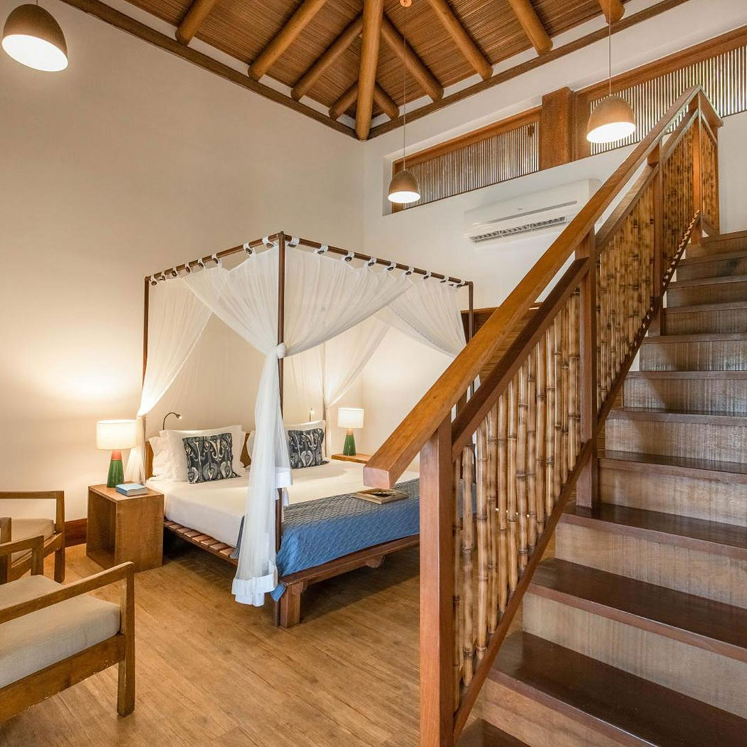 Les suites se situent dans le bâtiment central, face à la mer, ou dans les bungalows sur pilotis, éparpillés au milieu des cocotiers, tous dotés d’un ponton panoramique offrant des vues imprenables. Les intérieurs sont un luxueux compromis entre rustique et contemporain : grand lit à moustiquaire, vue panoramique à travers de larges fenêtres, espace aéré. Les salles de bains sont équipées de douches extérieures et certains bungalows proposent même des jacuzzis ou des bassins privés à l’air libre.