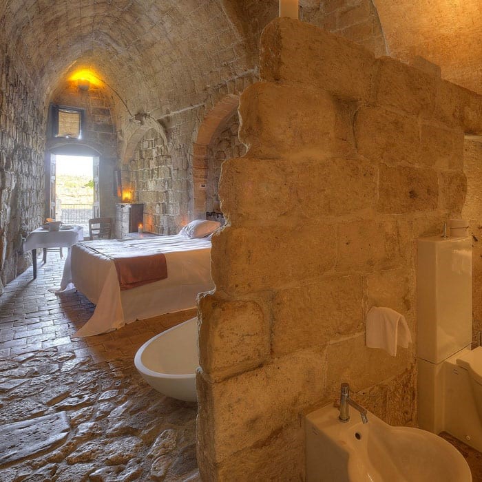 Ouvertes sur le parc national de l'Alta Murgia, les 18 chambres surprennent d’abord par un dénuement quasi monastique qu’habillent à peine quelques touches design savamment dosées – contraste d’un mobilier sombre sur la pierre blonde, baignoires signées Starck – voire carrément dérobées – jeux de clair-obscur subtils entre chandelles nues et ampoules encavées. Derrière cette occupation humble de l’espace historique, l’ambition de l’entreprise ne fait cependant aucun doute : il suffit d’imaginer l’âge de ces murs.