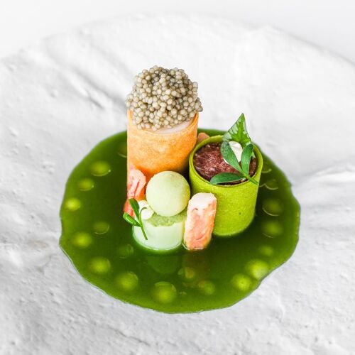 Vingt nuances de gris forment le cadre séduisant et sobre de Sel Gris. Les éléments design et les finitions luxueuses soulignent le confort. Mais ce sont les fenêtres qui jouent ici les vedettes. Le restaurant est situé sur la digue et offre une jolie vue sur la plage et la mer du Nord. Une source d’inspiration pour Frederik Deceuninck. Dès les mises en bouche, on découvre son enthousiasme. Le chef Deceuninck mêle créativité et finesse, à travers des plats travaillés, souvent présentés sur plusieurs assiettes, avec un souci du détail. Saumon et asperges, associés dans un bel équilibre subtil, ou faisan accompagné d’une sauce fine champagne sublime et de foie gras : cette cuisine est fascinante. Son inventivité avec les légumes, la juste acidité et les inspirations asiatiques sont passionnantes. L’interaction entre les différents accompagnements et le produit de base crée de nouvelles sensations à chaque bouchée. Chez Sel Gris, le produit est roi.