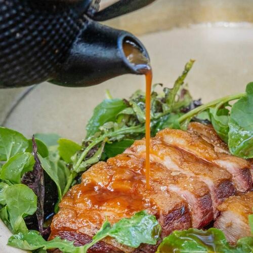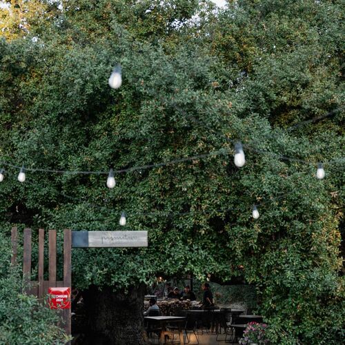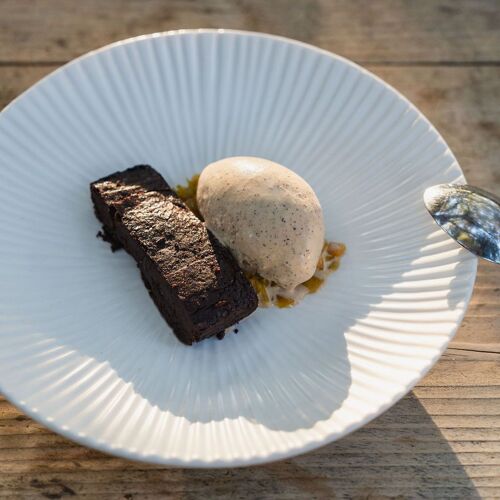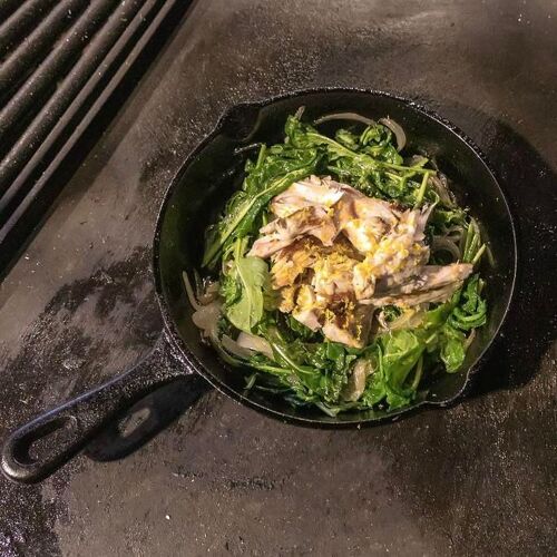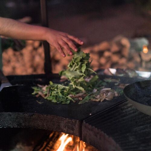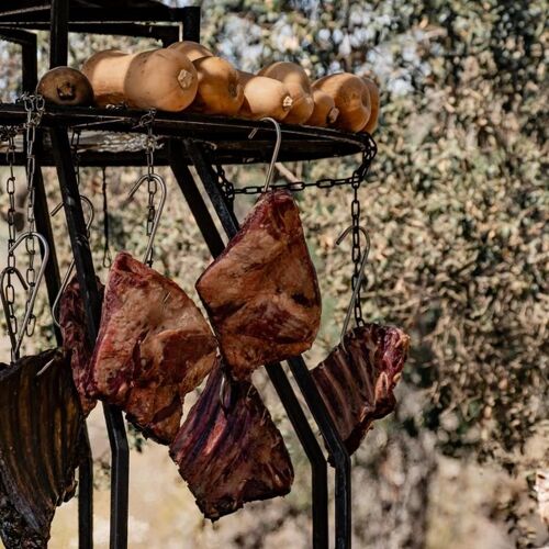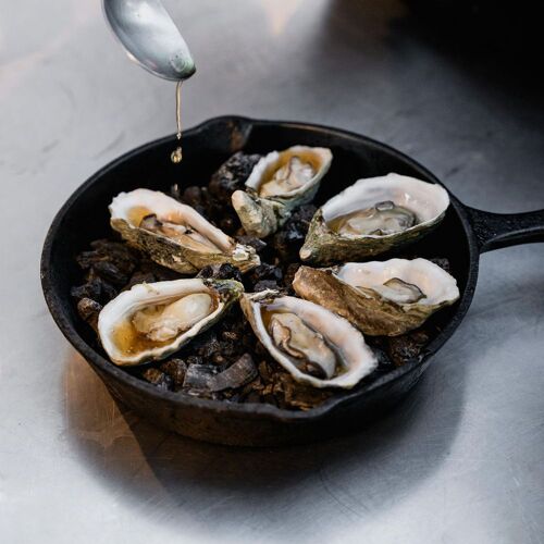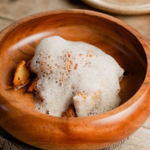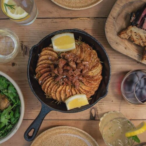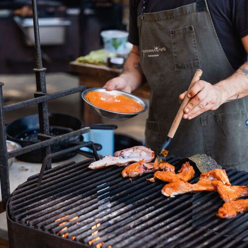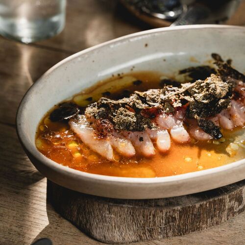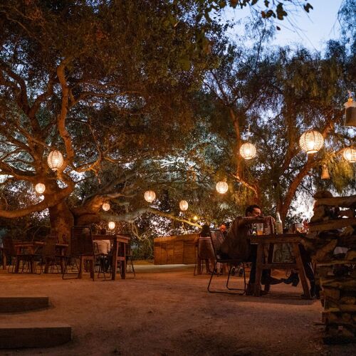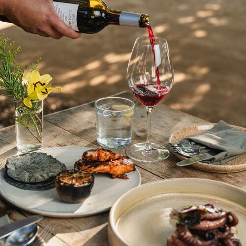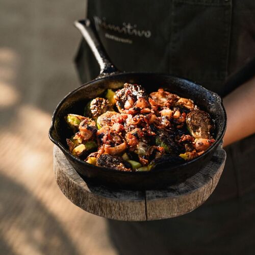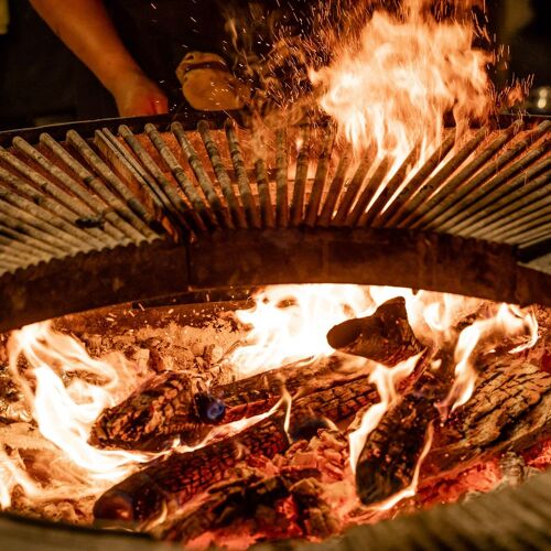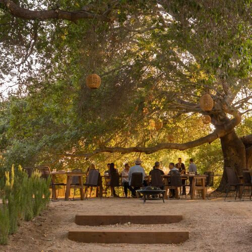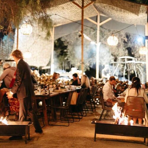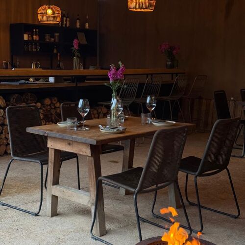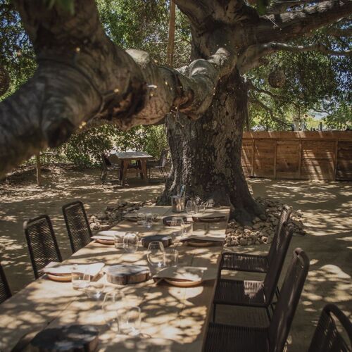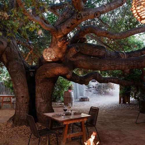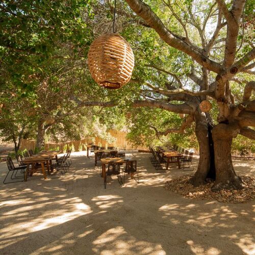 Indeed, the name says it all at this rugged space that's down a dirt road, past a fence draped with wine bottles. and situated under a sprawling oak tree that is three centuries old. The kitchen is anchored by a large fire pit where ingredients are cooked in cast-iron dishes or directly on the flame. Chef Carolina Jimenéz brings a unique approach to this rustic menu rooted in local sourcing. There are oysters to start before guests pick a protein, then savor multiple courses sized for sharing and utilizing every part of the fish or animal. The cooking is earnest, focused, and clever. Dessert is a must, especially that fudgy, flourless chocolate cake with candied orange peel and a quenelle of smoked lavender ice cream.