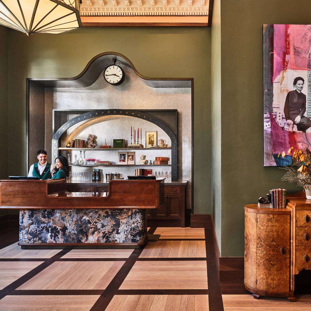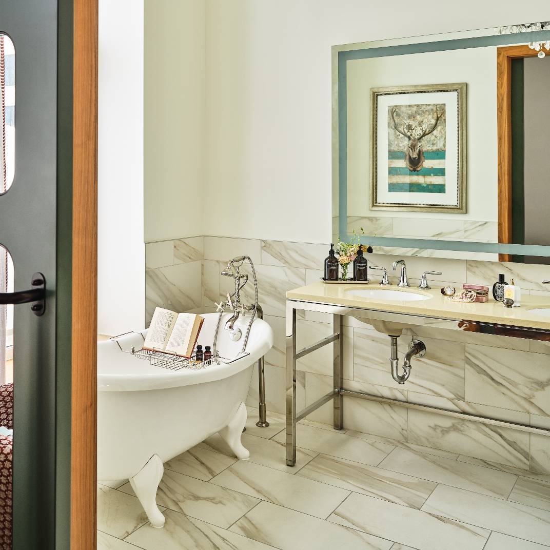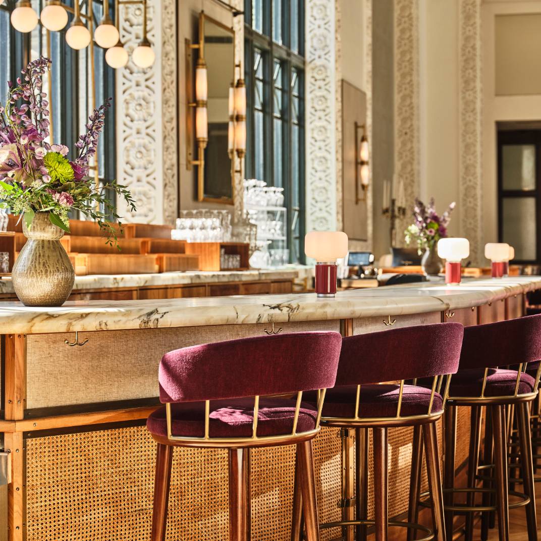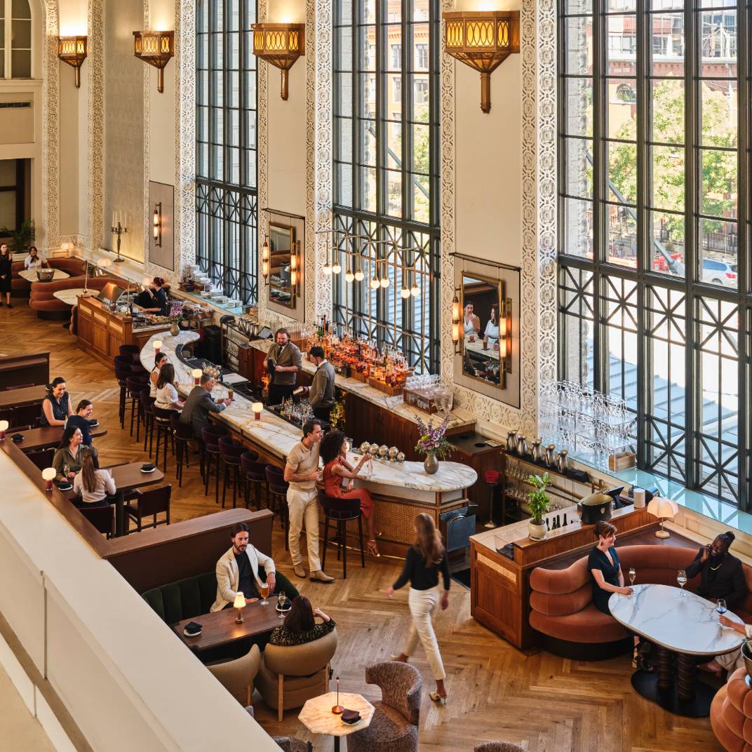 The rooms are located on the upper floors in what used to be offices ringing the soaring 65-foot central hall. It took a massive renovation to make these spaces habitable, and the results are impressively luxurious, with nods to Victorian elegance, Art Deco swankiness, and contemporary post-industrial loft living, depending on the room type. And there’s more to the Crawford than just the rooms and the lobby — a selection of shops, restaurants, bars and cafés share the space.