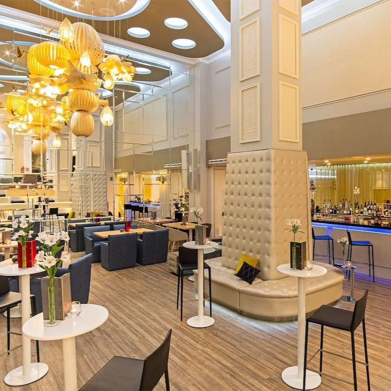 The building itself, a classic private residence before it was an embassy, is suitably elegant and spacious, with soaring marble pillars, high archways, and decorative wrought-iron staircases. There’s a serious art collection (including an original work by the contemporary Spanish painter Javier Mariscal), as well as a refined Sunday brunch featuring foie gras and overseen by a Michelin-starred chef, and a cocktail bar with classic cocktails and Chesterfield sofas.