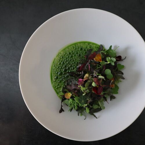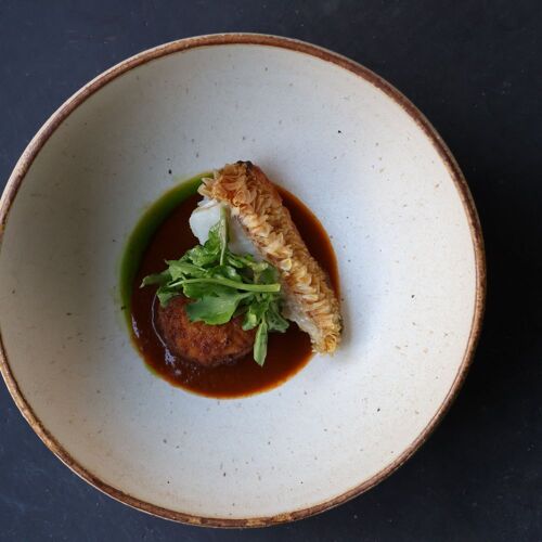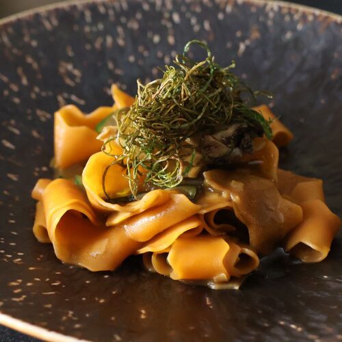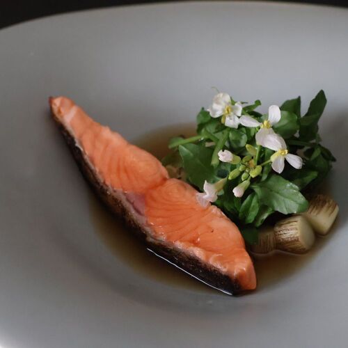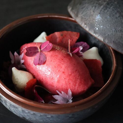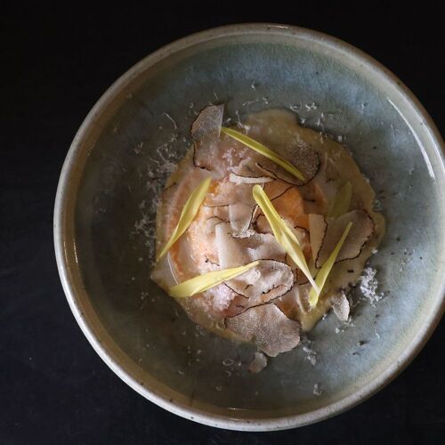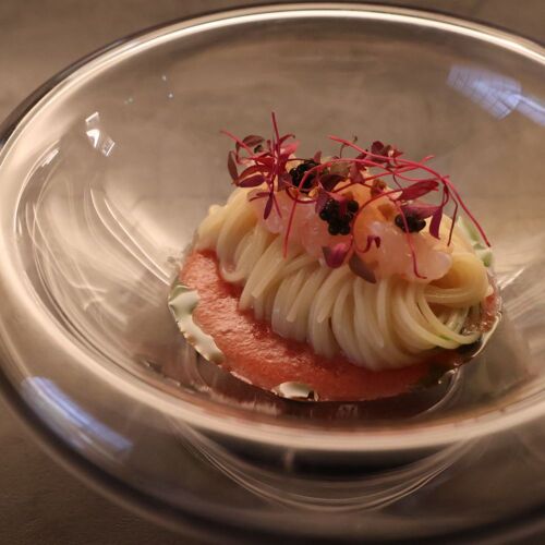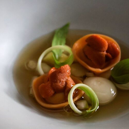 Etto is Italian for ‘intimacy’. It’s hard to tell where the counter ends and the open kitchen begins, so guests and chef become entwined in a single, intimate space. Italian cuisine is accented by Japan’s four seasons. Antipasto misto, served on a Kiyomizu-yaki platter and strewn with leaves of the season, has a hassun sensibility. Five small dishes of salty and sour morsels keep the wine flowing.