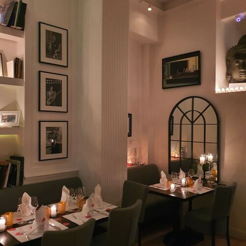 Shelves filled with books, trinkets and plants, paintings and photos on the walls set the scene for what feels like the inviting sitting room of a lovely private mansion. Now let’s add the appeal of market-fresh cuisine, an abundance of culinary delights and a commitment to respecting the seasons, without forgetting the gracious welcome and service.