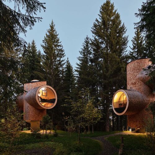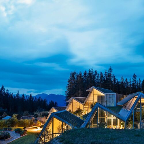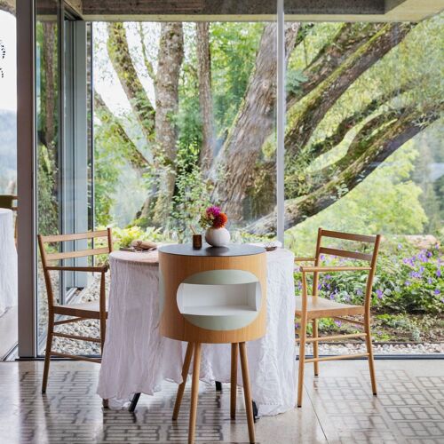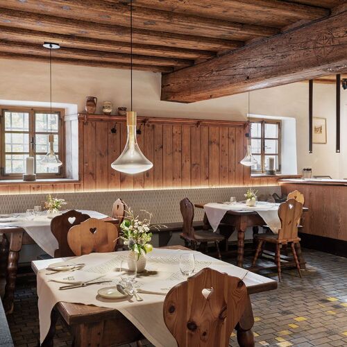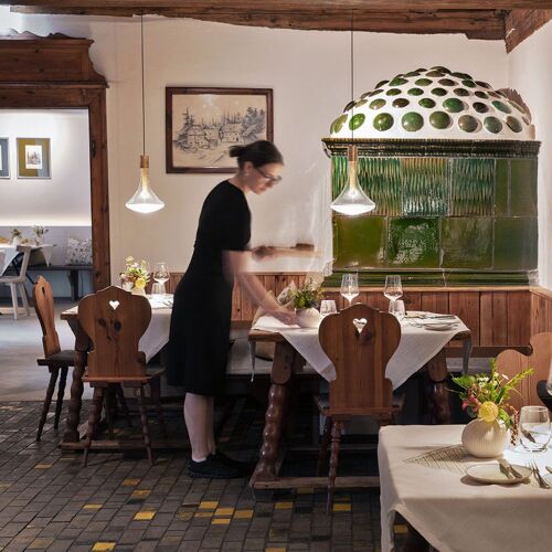 A meal here is a delightful experience! The kitchen team has an abundance of excellent ingredients at its fingertips, from its own farm or from the surrounding area – something you rarely find! On Wednesdays the spotlight is on garden, field and forest, on Thursdays on offal, on Fridays on freshwater fish, and on Saturdays they mix it up. Attentive service courtesy of well-trained staff, who are happy to provide information about the sustainable philosophy. In addition to the inviting series of dining areas ranging from cosy and rustic to light and modern, there is also a terrific terrace with a beautiful view. As a convivial alternative, the ‘Schankkuchl’ offers meals prepared over a fire or steam at a communal table (Thurs.-Sat.). This wonderful estate surrounded by nature is also an unusual place to stay overnight: Here you will find very individual accommodation, from the ultra-modern tree house and former stables to the converted hunting lodge or the glass house.