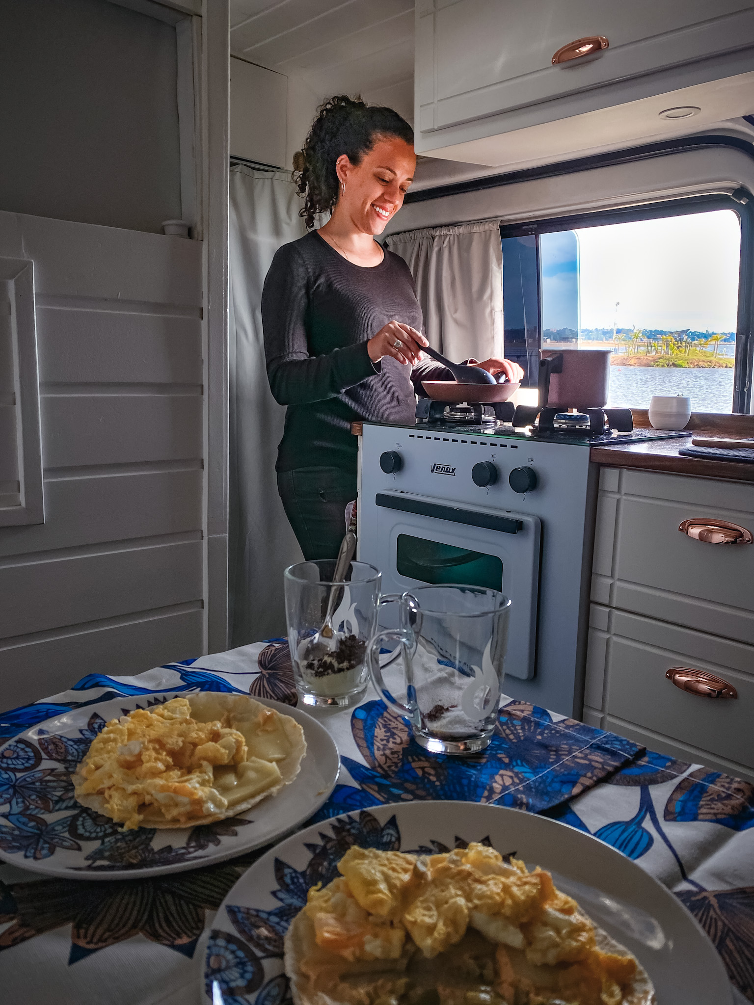 Família Pasquoloto faz todas as refeições na casa rodante, tendo o mundo como quintalDurante os oito anos em que moraram em um apartamento em Santos (SP), comida pronta ou congelada era sempre o cardápio da casa, onde o forno não foi usado mais que duas vezes. “Agora fazemos 99% das refeições no motorhome. Não estamos de férias, vivemos dentro do carro, ele é nosso lar”, diz Fernanda, que descobriu o gosto pela cozinha na rotina nômade, fazendo desde comidas triviais e pratos preparados com ingredientes locais das regiões por onde estão passando.