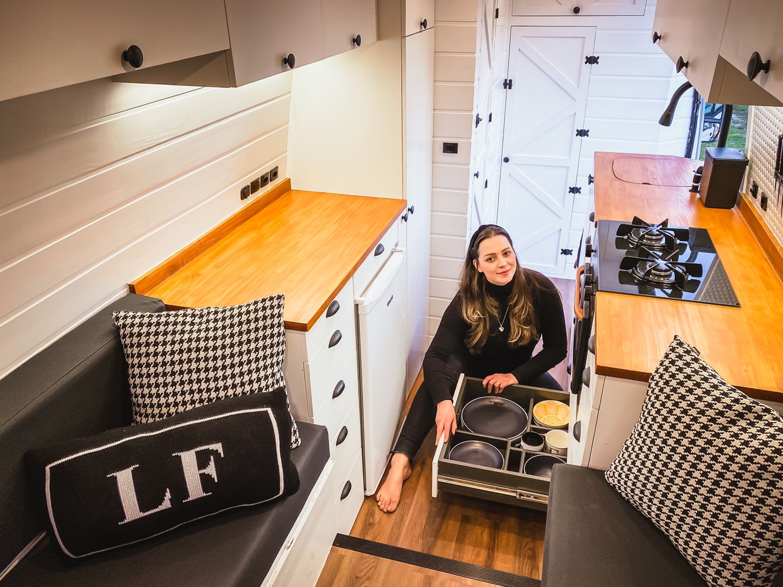 Leonardo e Fabíola Valle sempre gostaram de cozinhar. Por isso, quando o casal de Brusque (SC) decidiu mudar de vida e viajar pela América em uma van, a cozinha ganhou prioridade no projeto de 8m2. “Temos uma estrutura completa, com todos equipamentos e utensílios que precisamos. Como não abrimos mão da qualidade do que comemos, do molho de tomate caseiro até receitas mais elaboradas, como pad thai, tudo sai da nossa minicozinha, onde só não entra fritura, por causa do cheiro que pode deixar”, ela conta.