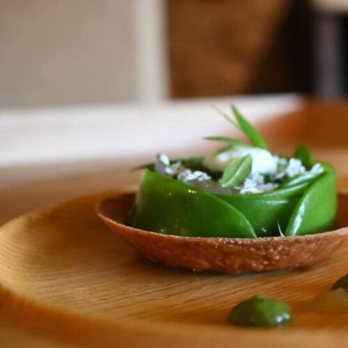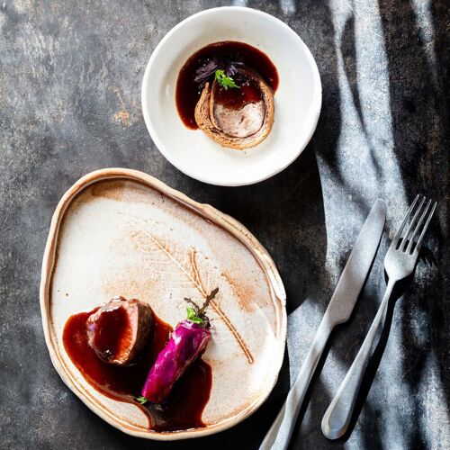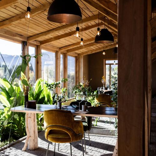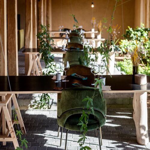 "Local produce, in season, treated with respect from farm to table and at a fair price is the philosophy at La Bòria. Almost all the ingredients are grown or raised in the Ardèche, the sourdough bread is made on site, as is the charcuterie. The building produces its own electricity by solar panels, rainwater is collected and local materials have been used for the construction (the roof structure is made of Ardèche chestnut), the furniture and the tableware."