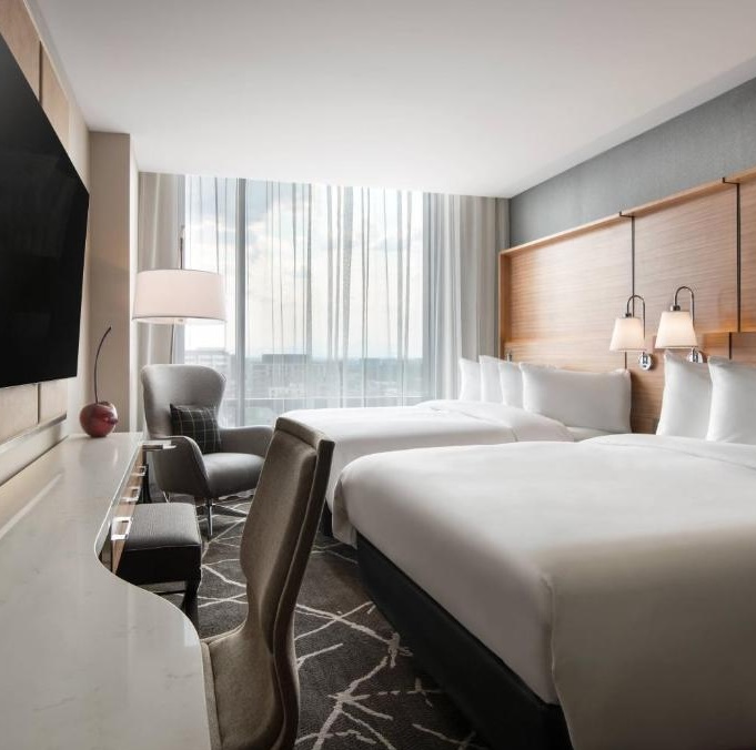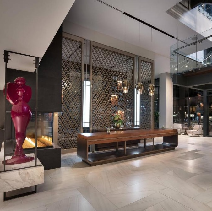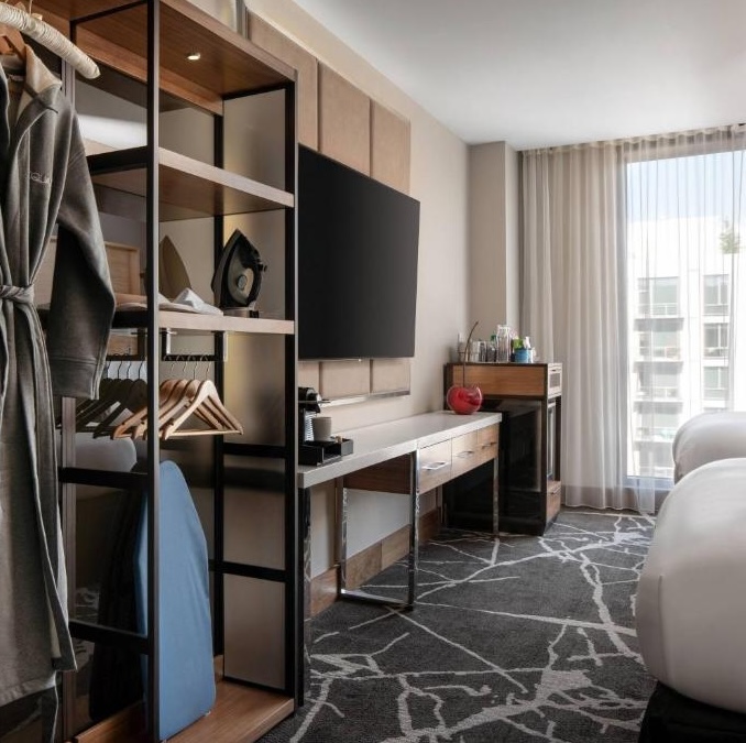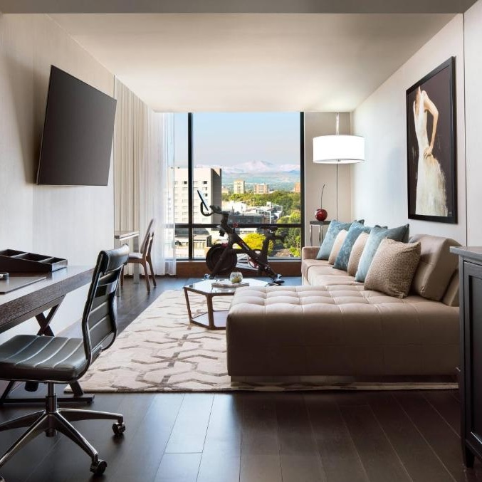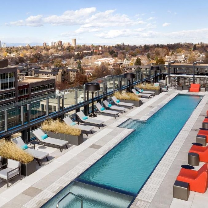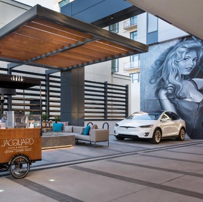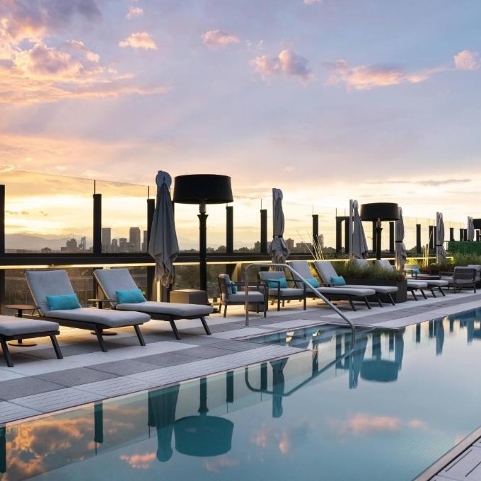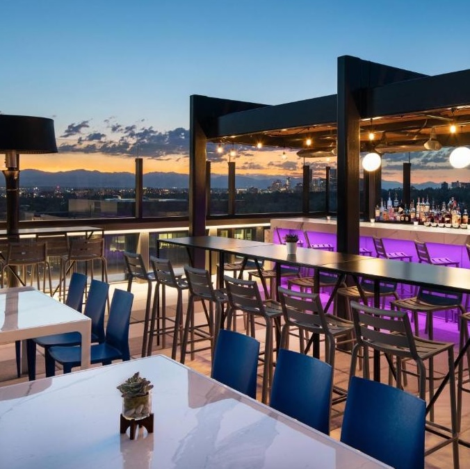 The Jacquard sits in Cherry Creek's retail heart, named for the French inventor who mechanized textile weaving and democratized fashion. A floating staircase and neon chandelier command the multi-story lobby, while guest rooms feature glass walls and carpeting that references the district's design legacy. Kisbee on the Roof delivers the real payoff: craft cocktails against a 180-degree mountain panorama stretching from Longs Peak to Pikes Peak, with downtown Denver glittering below. Narrative handles New American standards downstairs. The fitness center stocks Peloton bikes, as do the suites. Service stays sharp, the crowd is stylish, and the rooftop at sunset rivals any perch in the city.