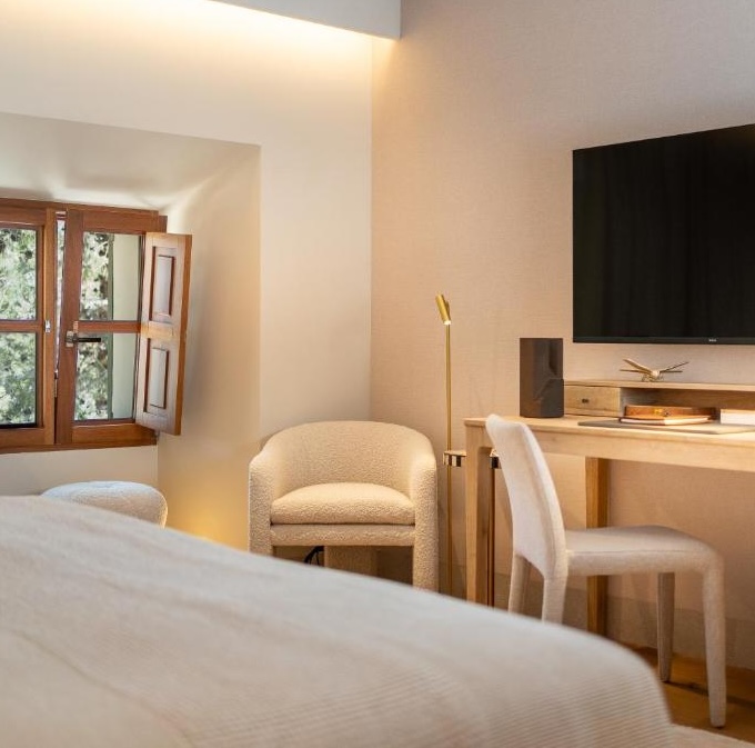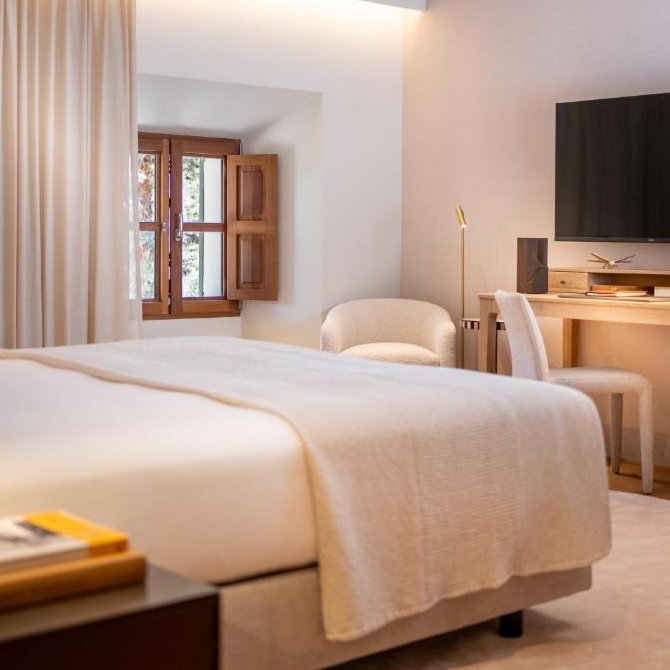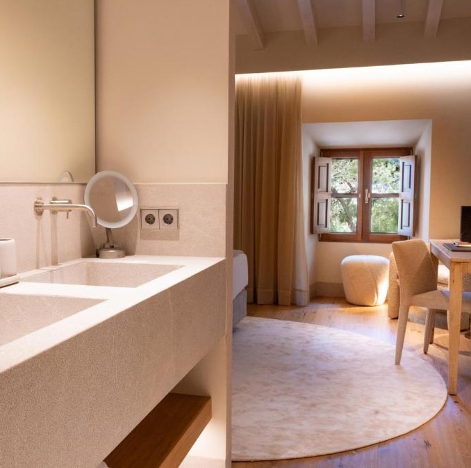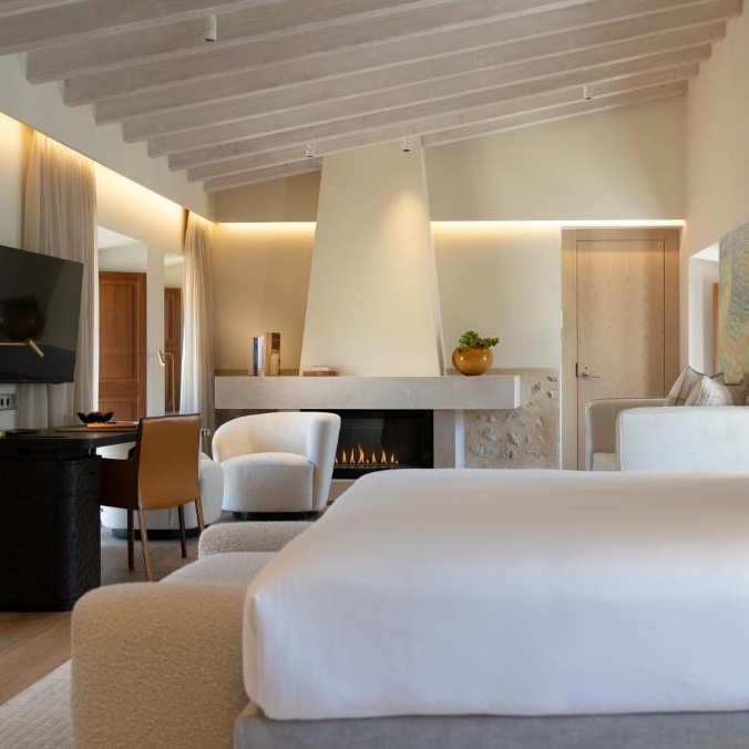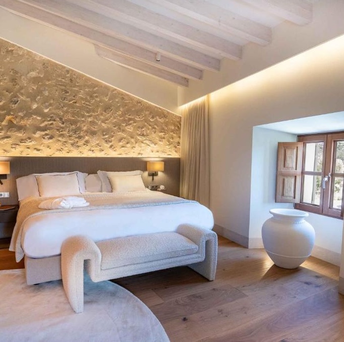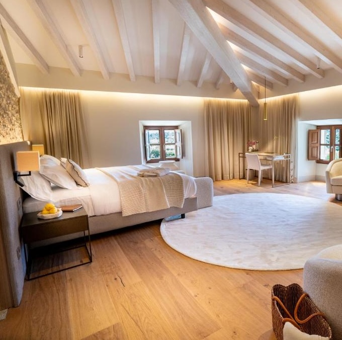In the hills above Alaró, Finca Banyols carries the weight of centuries as a former olive oil mill, its stone walls and timber beams now restored into a refined rural retreat. The main house combines heritage features of beamed ceilings, wooden floors, and natural stone with understated modern design. Rooms are serene and elegant, with Egyptian cotton linens and views of the Mallorcan countryside. Treatments in the spa draw on ingredients harvested from the land, including olive oil and honey, a fitting tribute to its origins. With gardens, pools, and private trails, the Finca offers a stay where Mallorca’s history is inseparable from its setting.