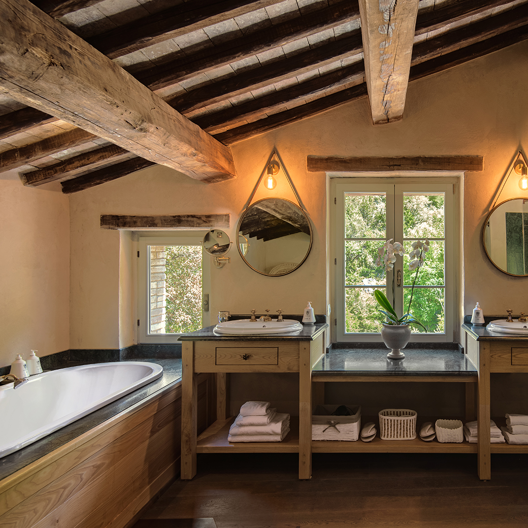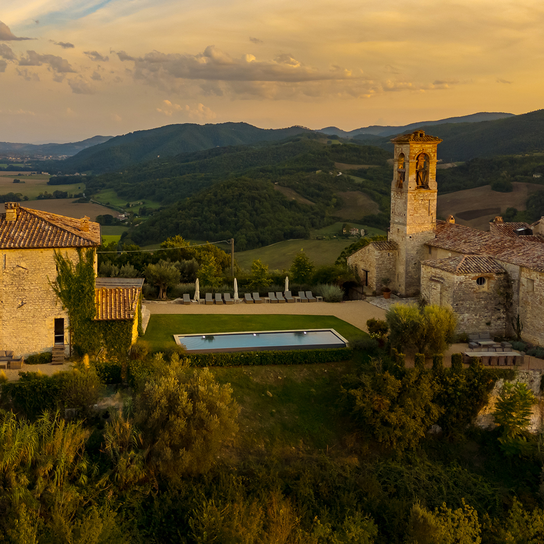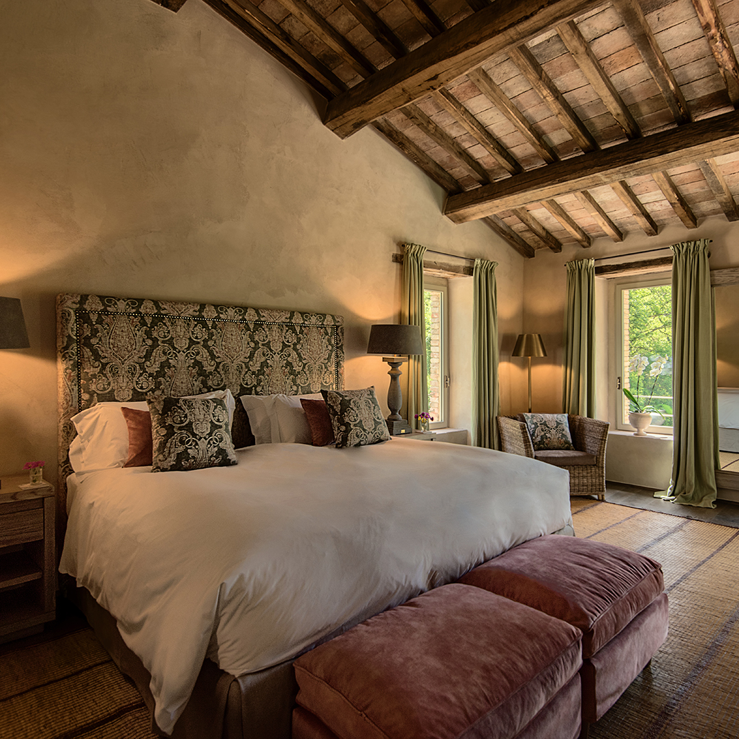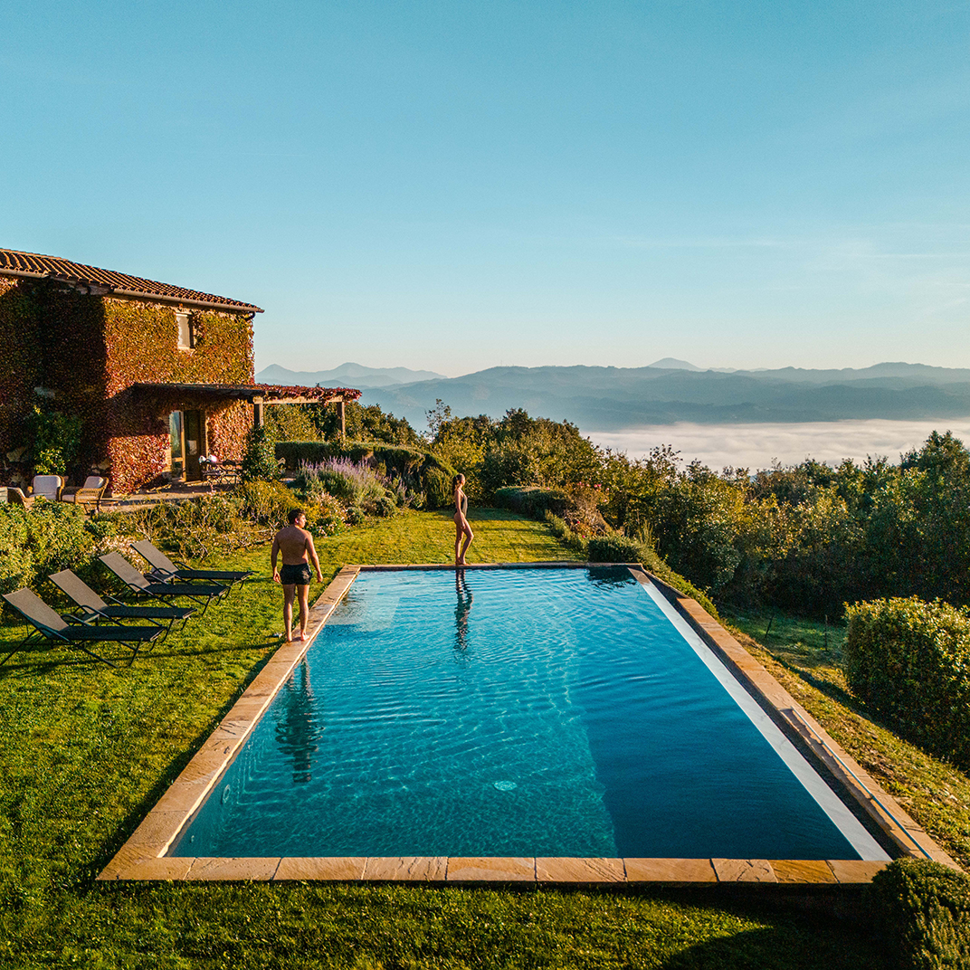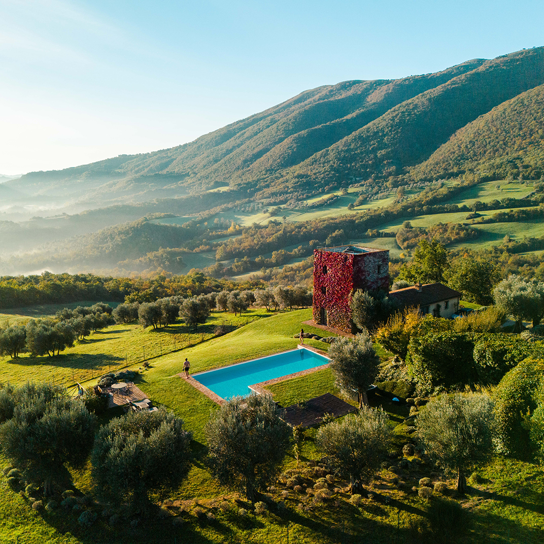 Tenuta di Murlo sits on thousands of acres of Umbrian hills, largely untouched since World War II, when farm workers left and over fifty structures fell into ruin. Alessio and Carlotta Carabba Tettamanti have spent twelve years restoring parts of the family estate: a 14th-century parish church with four bedrooms, scattered cottages, a castle that sleeps twenty. The landscape remains the main draw: deep green ridges, stone watchtowers, a working water mill. Guests stay in converted farmhouses with kitchens stocked from the estate's own land, or book a chef if they'd rather not cook. Il Caldaro, the on-site restaurant, serves porcini and wild boar in autumn, broad beans in summer, all eaten outdoors under the hydrangeas.