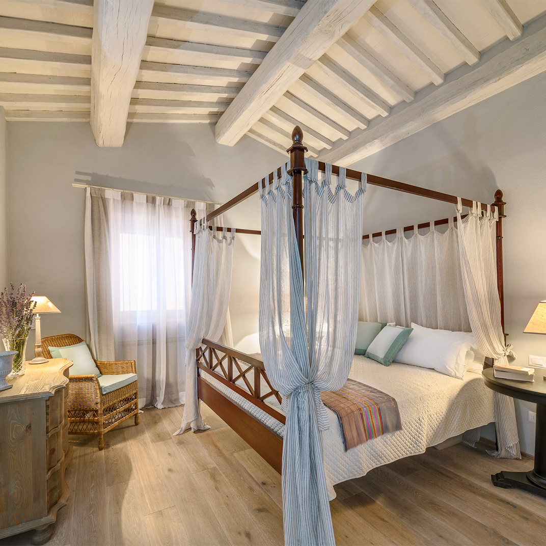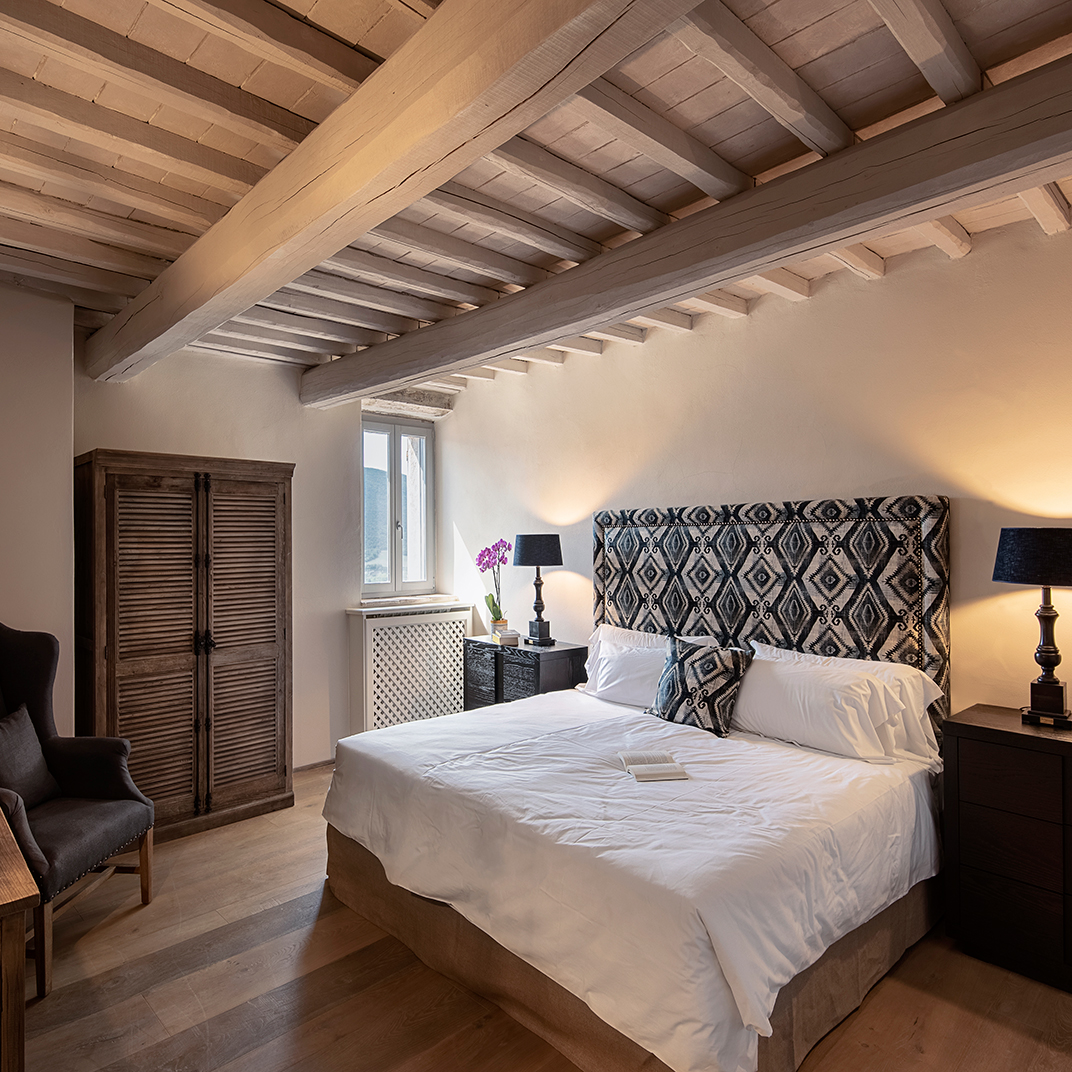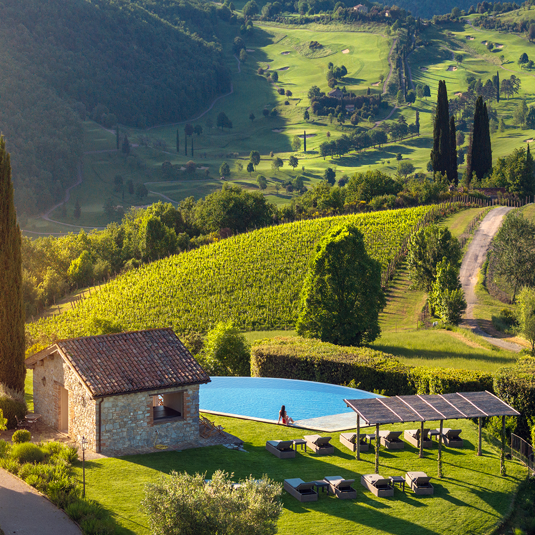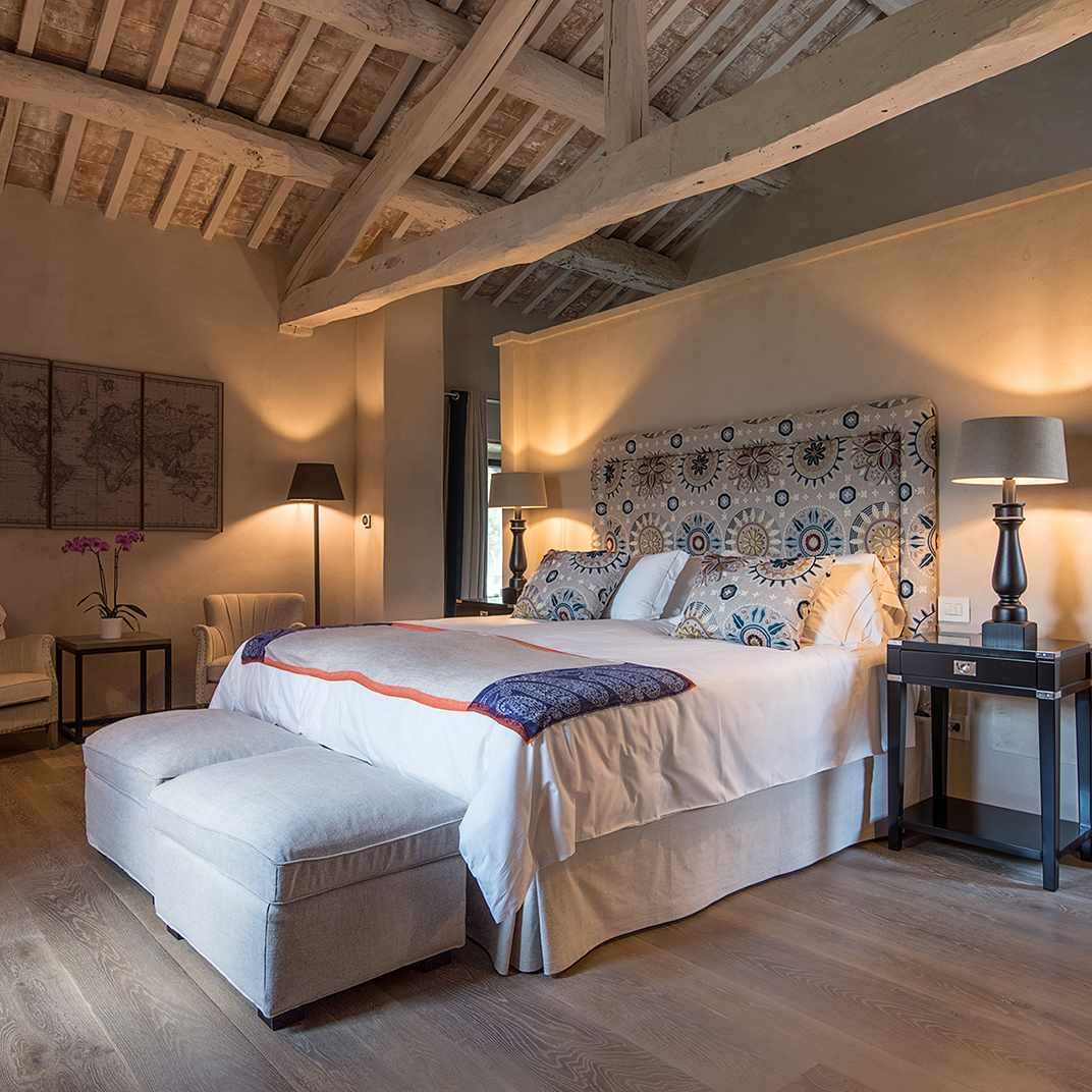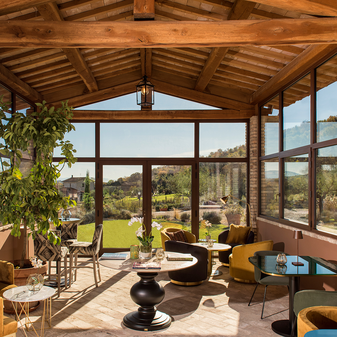 Tenuta di Murlo sits on thousands of acres of Umbrian hills, largely untouched since World War II, when farm workers left and over fifty structures fell into ruin. Alessio and Carlotta Carabba Tettamanti have spent twelve years restoring parts of the family estate: a 14th-century parish church with four bedrooms, scattered cottages, a castle that sleeps twenty. The landscape remains the main draw: deep green ridges, stone watchtowers, a working water mill. Guests stay in converted farmhouses with kitchens stocked from the estate's own land, or book a chef if they'd rather not cook. Il Caldaro, the on-site restaurant, serves porcini and wild boar in autumn, broad beans in summer, all eaten outdoors under the hydrangeas.