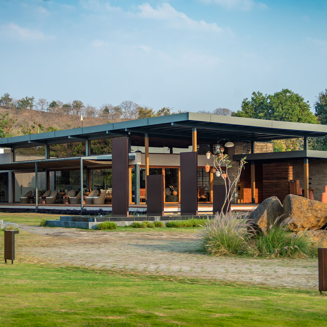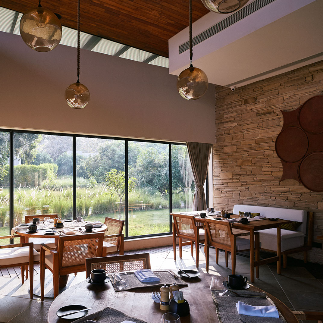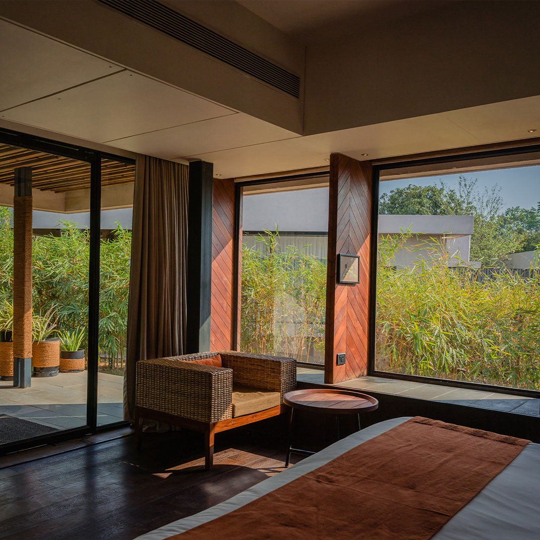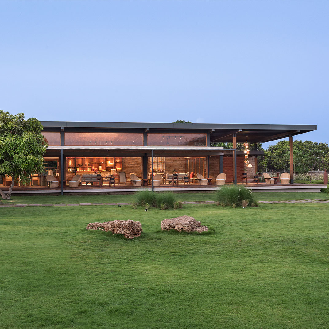 It takes some humility for a hotel as architecturally distinguished as Woods at Sasan to use its name to honor its setting rather than itself. But site-specificity is one of the cardinal virtues of modern architecture, and Woods at Sasan’s structures use floor-to-ceiling windows and plentiful indoor-outdoor spaces to blend the interior experience with that of its location, an 8-acre mango orchard at the edge of Gujarat’s Sasan Gir National Park, home to Asia’s last remaining lions.
