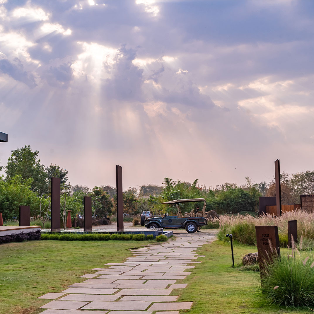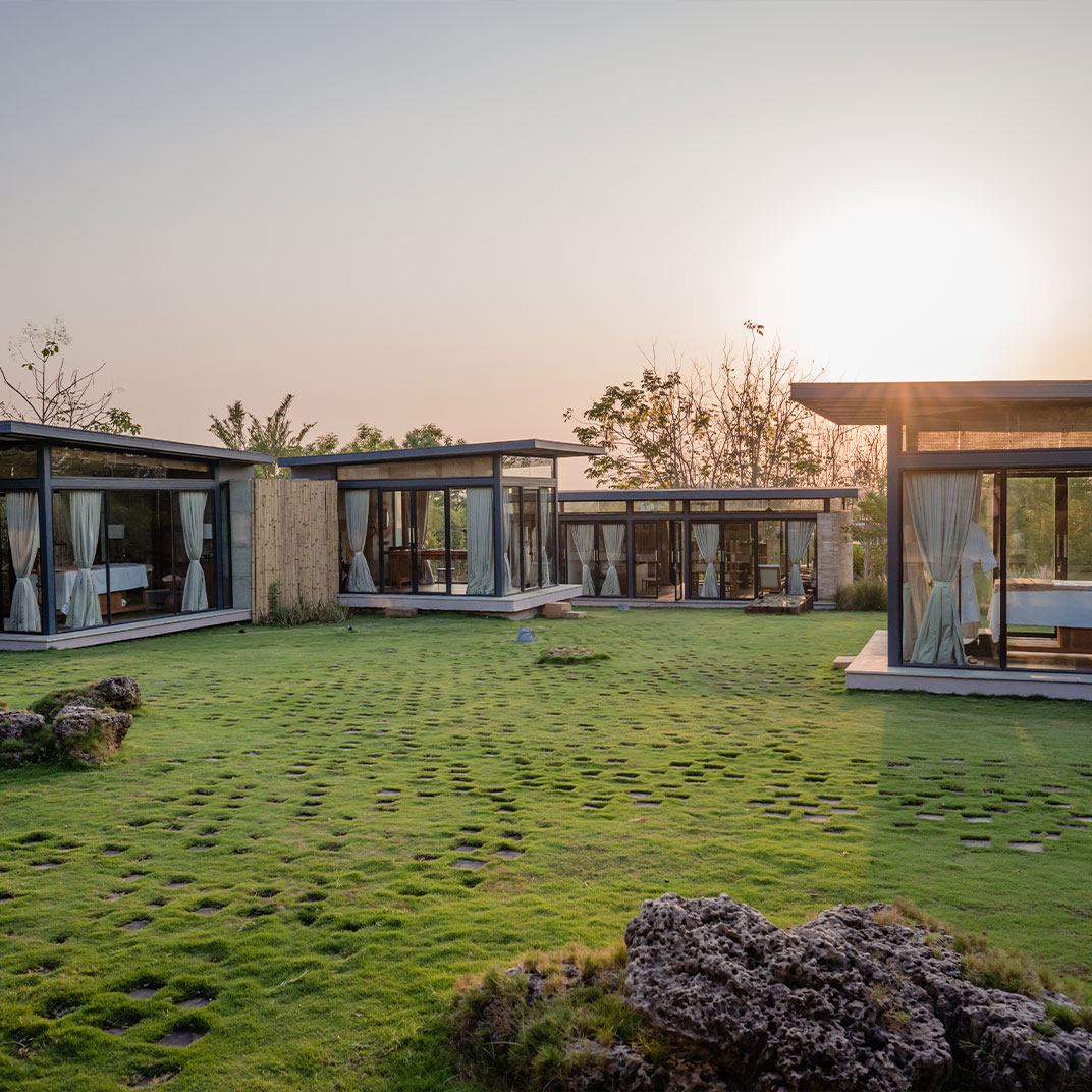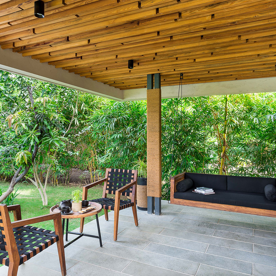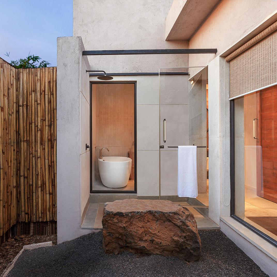 It takes some humility for a hotel as architecturally distinguished as Woods at Sasan to use its name to honor its setting rather than itself. But site-specificity is one of the cardinal virtues of modern architecture, and Woods at Sasan’s structures use floor-to-ceiling windows and plentiful indoor-outdoor spaces to blend the interior experience with that of its location, an 8-acre mango orchard at the edge of Gujarat’s Sasan Gir National Park, home to Asia’s last remaining lions.