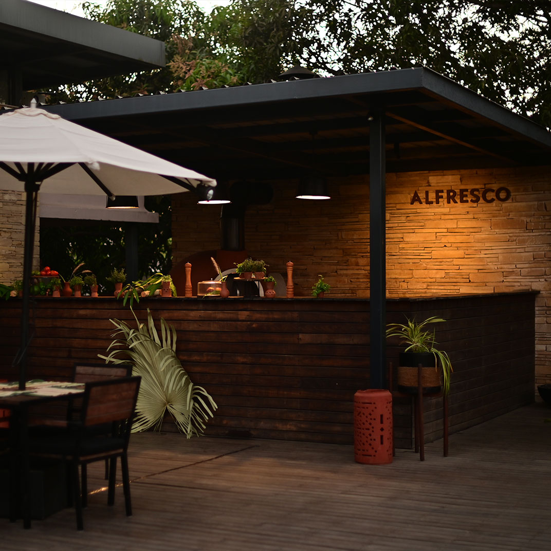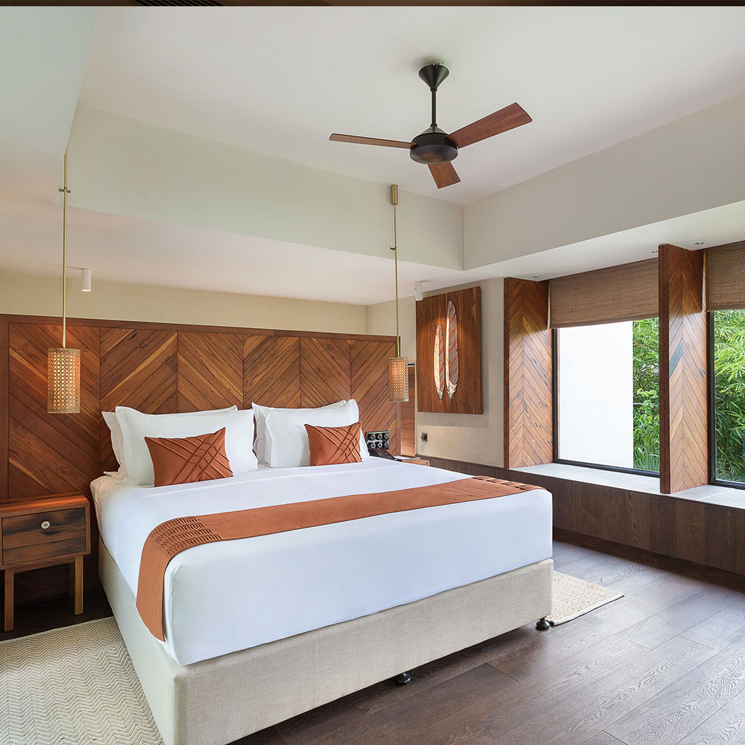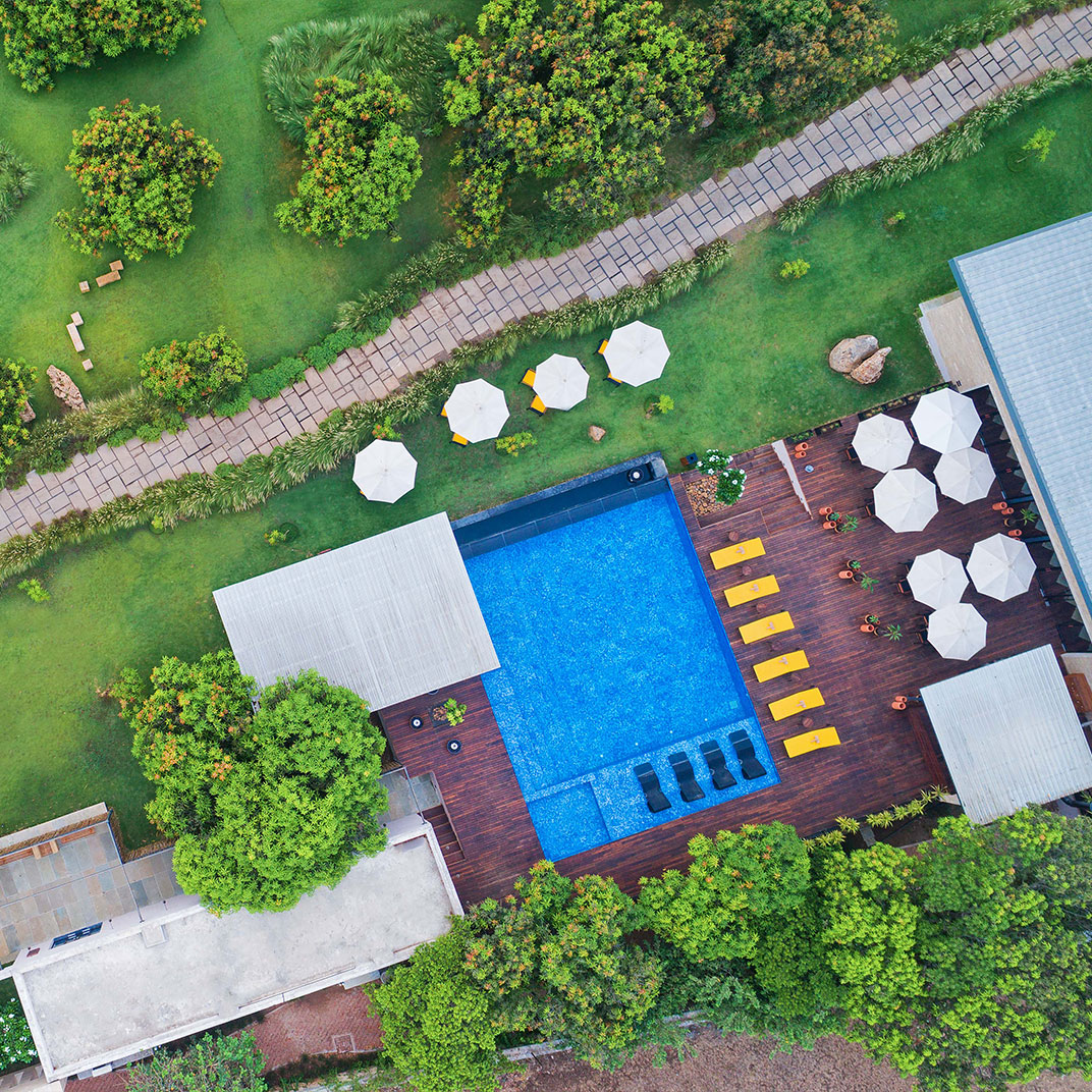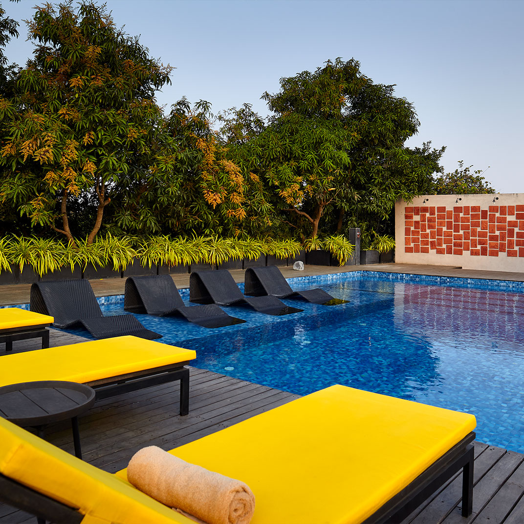 It takes some humility for a hotel as architecturally distinguished as Woods at Sasan to use its name to honor its setting rather than itself. But site-specificity is one of the cardinal virtues of modern architecture, and Woods at Sasan’s structures use floor-to-ceiling windows and plentiful indoor-outdoor spaces to blend the interior experience with that of its location, an 8-acre mango orchard at the edge of Gujarat’s Sasan Gir National Park, home to Asia’s last remaining lions.