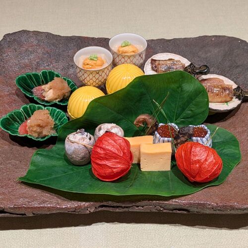 At the entrance is a branch of an izakaya chain, but walk through it to the back to find the sign and shop curtain for Takoyakushi Furukawa. The meal unfolds from the drawing of dashi stock, ensuring that you experience the beguiling aroma and taste of the basic clear stock. The menu is extensive, presenting the flavours of the season a little at a time. The meal wraps up with a rice dish such as white rice, takikomi-gohan or zosui. No effort is spared in expressing passion and pride in each dish.