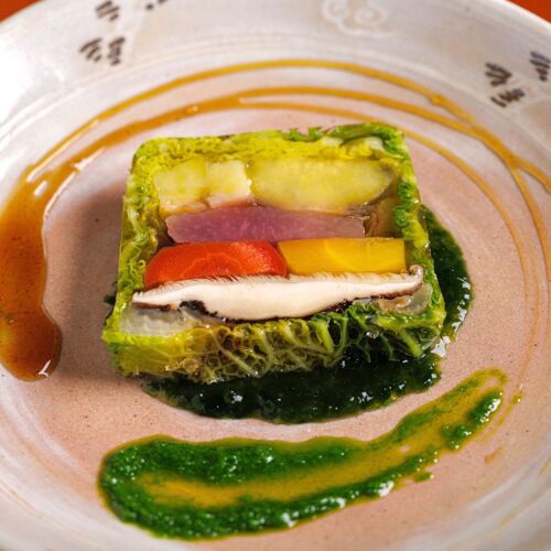 A menu only a chef who honed his craft in Kyoto, Osaka and Paris could conjure. He calibrates his flavours by gathering ingredients in Kansai and drawing his dashi soup stock from ma-kombu kelp and dried tuna flakes. The spirit of frugality espoused at Oryori Matsumura decrees that each ingredient should be used completely. For example, the bony parts of fish left over are used up making sea-bream miso and dashi. By bringing together the aesthetic senses of disparate locations, Oryori Matsumura has created a cuisine that is refreshingly original.