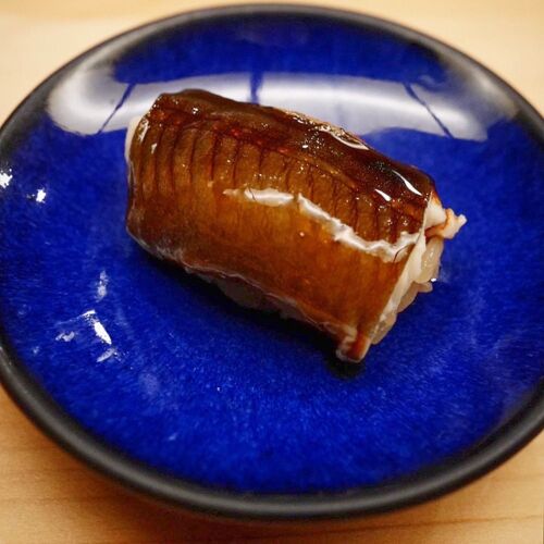 When you order sake, the chef presents a box of paulownia wood containing Satsuma and Tenma kiriko cut-glass drinking cups. These craft traditions of Kagoshima and Osaka tell of where the chef was born, and where he apprenticed. Fish is selected at Tsuruhashi Market. The meal starts with snacks before proceeding to more creative preparations, attesting to his experience. Nigiri are formed small, in the hope you will sample as many different items as possible. The chef’s ready smile is another factor that keeps diners coming back.