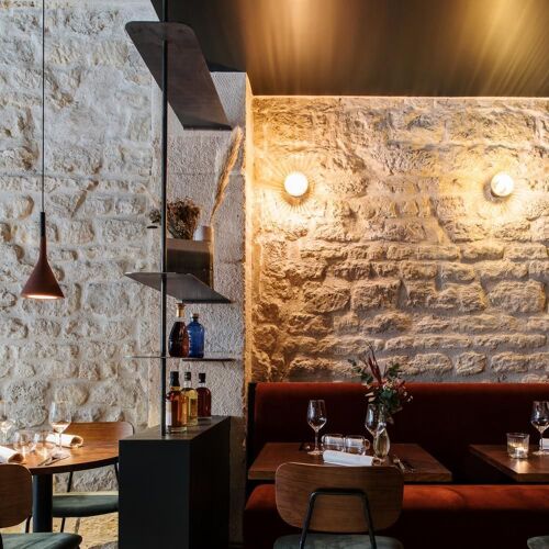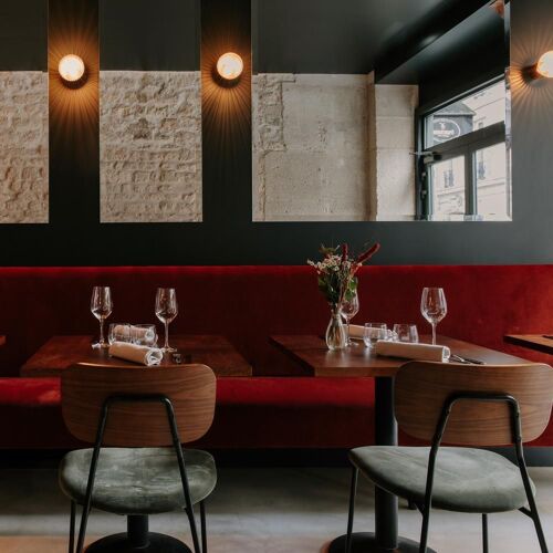 A friendly and contemporary bistro, with exposed stone and dark green walls, mirrors and velvet banquettes. A Korean chef, who is passionate about French gastronomy, creates modern cuisine with occasional nods to his home country, and it proves to be a winning formula: for example, his starter of burrata, duck breast, basil/arugula pesto and sesame. In the evening, he pulls out all the stops, with premium ingredients and more sophisticated dishes (and a tasting menu).