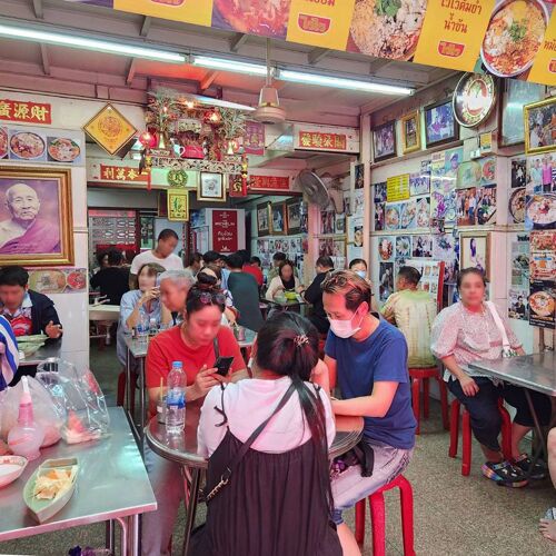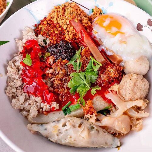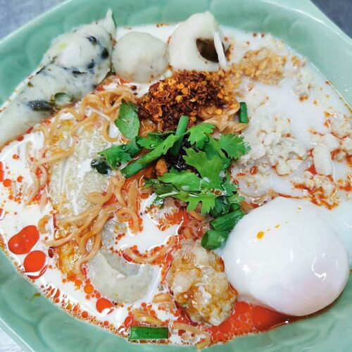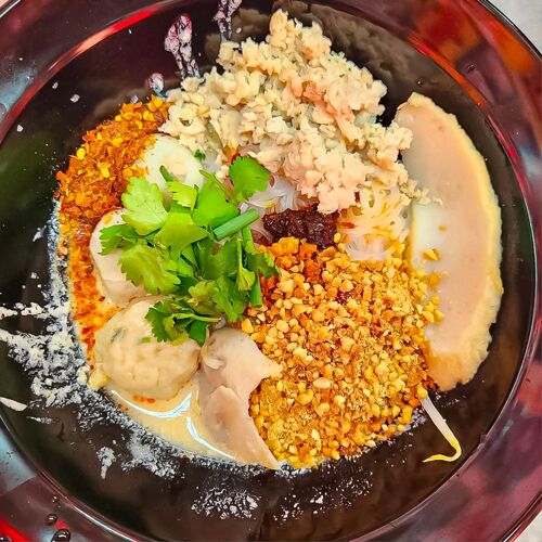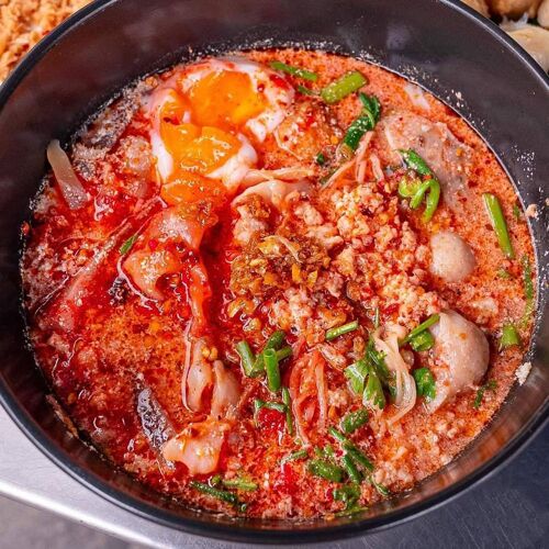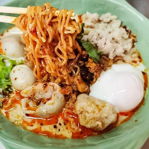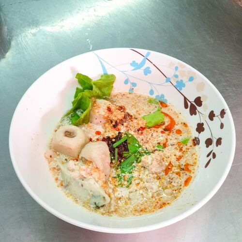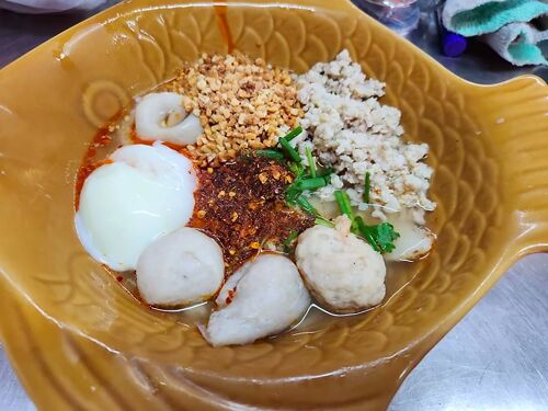 This hidden gem, tucked away in a Bangkok alley since 1999, excels in fish ball noodle soup. They offer fresh, umami-rich fish balls, al dente noodles, and a savoury, aromatic broth. Optional toppings like cheese and poached egg, along with large servings and ample condiments, provide great taste and value.