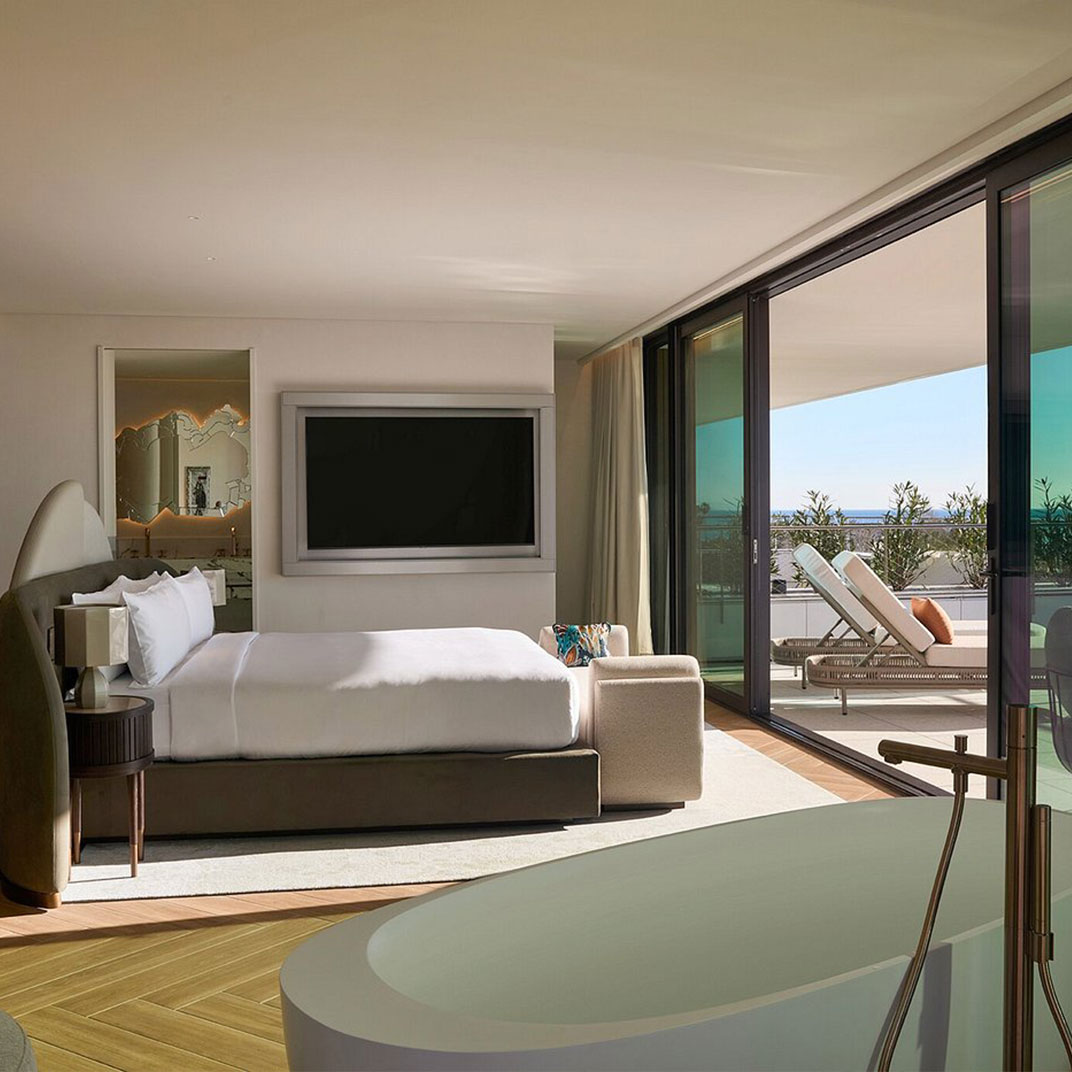 SLS Barcelona delivers the city’s electric energy straight to the water’s edge. Rooms and suites all come with a balcony or terrace, many framing marina views or the Mediterranean beyond. Inside, it is maximalist in the best way: bold lines, glossy textures, and a flirtatious energy that runs through it all. From sun-drenched loungers by the pool to late-night cocktails on the beach, every space is designed to entertain. Whether you are in the mood for indulgence or just a change of pace, this is Barcelona with all the volume and none of the rules.