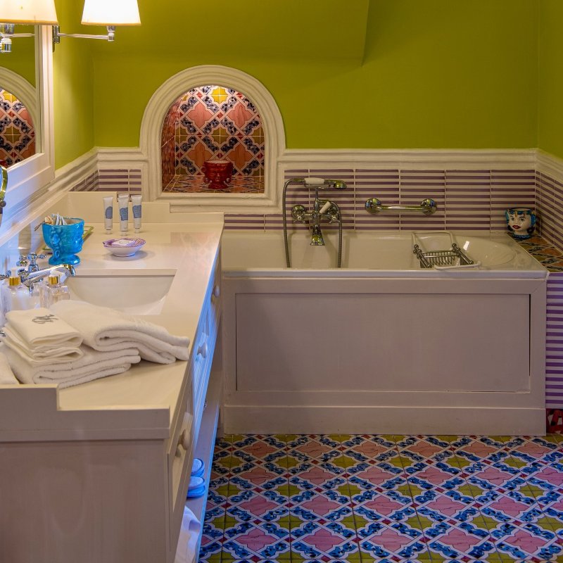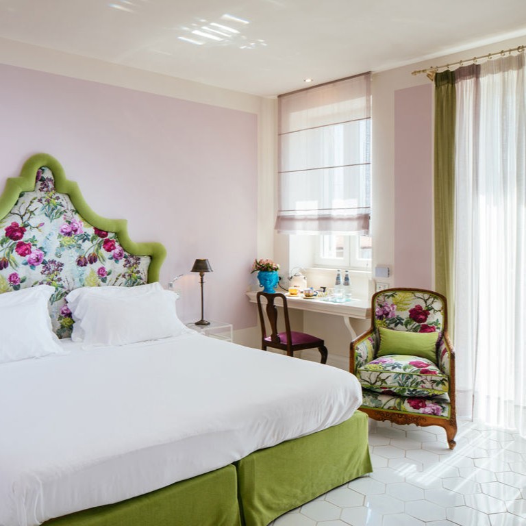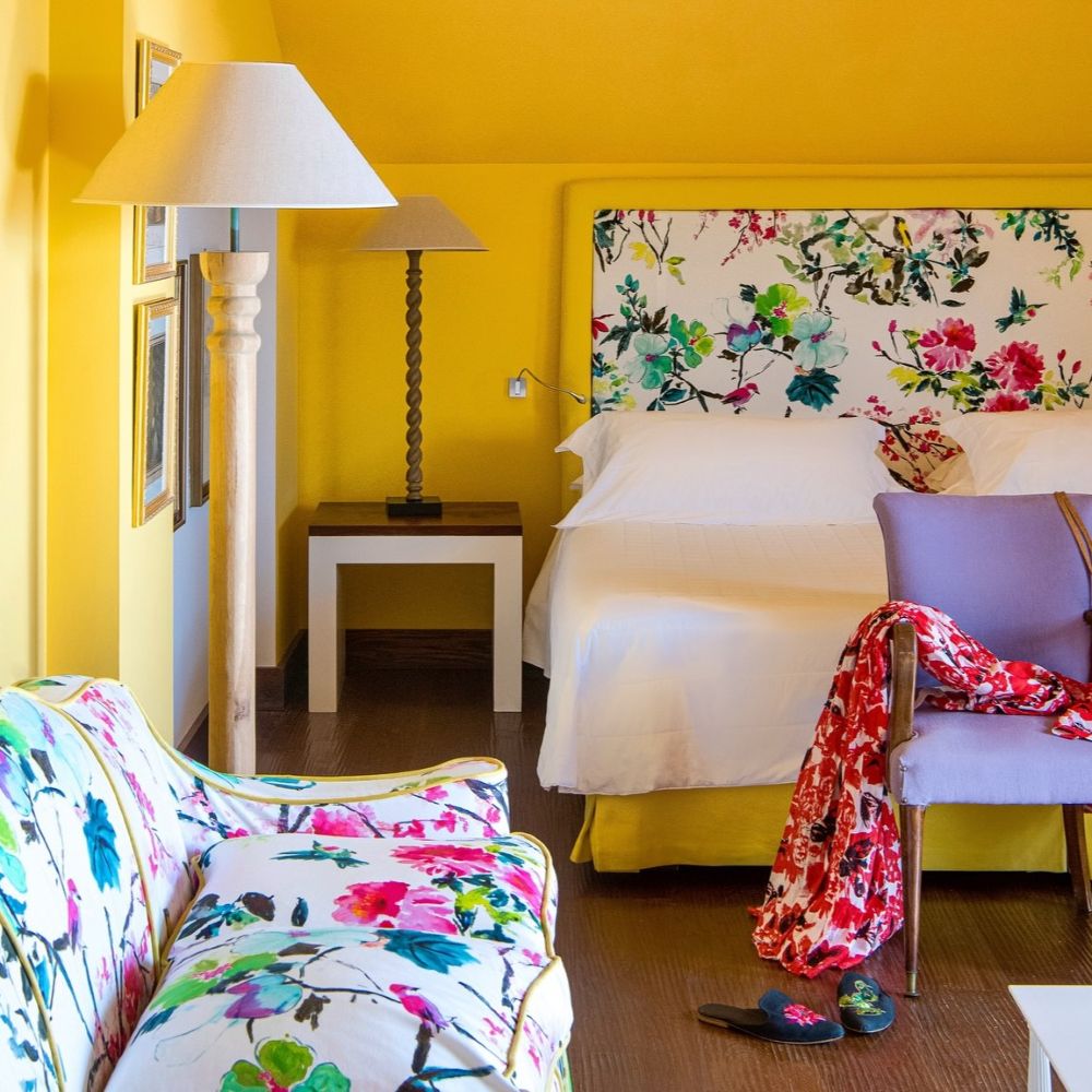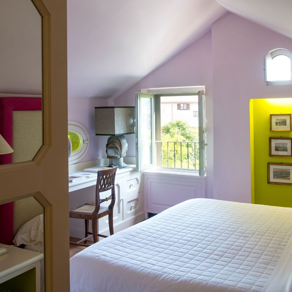 While the menu at Don Alfonso 1890’s starred restaurant may be more or less what you expect, given its setting just inland from the Amalfi Coast, it’s safe to say the interior design probably isn’t. This renovated 19th-century house, in Sant’Agata sue Due Golfi on the Sorrentine peninsula, has traditional elements, but the fanciful color scheme — rose, magenta, and bubble-gum pink, with accents in canary yellow, lime green and cherry red — feels straight out of Alice in Wonderland. Guest rooms are charming and cheerful, with vaulted ceilings, locally made artwork, and hand-painted mosaics. Outside, a wide covered porch twinkles with tiny lights after dark; relax with drinks after a cooking class or a tour of the wine cellar and cheese aging room, located in a pre-Roman tunnel.