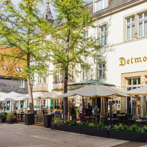 Dating from 16C, Detmolder Hof not only offers comfortable classical accommodation, but it is also home to Jan Diekjobst's restaurant, which is also worth a visit. After stints at Victor's FINE DINING by Christian Bau in Perl-Nennig and The Table Kevin Fehling in Hamburg (and others), here the chef cooks up a modern take on classic cuisine prepared with select ingredients. Diners are served by a very friendly, attentive team in a tasteful brasserie interior with high ceilings, a striking chandelier and handsome hardwood floors, as well as an open kitchen. In summer, the terrace in front of the building is a lovely setting in which to dine.