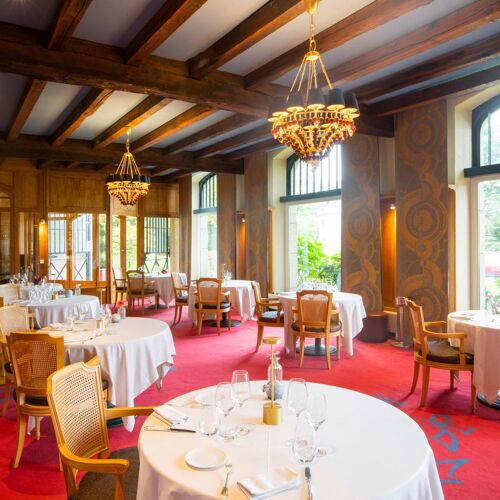 Les dépendances de l'imposant château médiéval de la Bretesche abritent ce restaurant plein de cachet qui ouvre sur le parc et le plan d'eau. En pleine nature, le lieu ne manque pas de charme, avec notamment son bar installé dans les anciennes écuries. Le chef réalise une cuisine dans l’air du temps où les poissons et fruits de mer ont une place prédominante, à l'image de cette langoustine légèrement fumée, tomate confite et citron caviar, jus des têtes crémé à l’estragon.