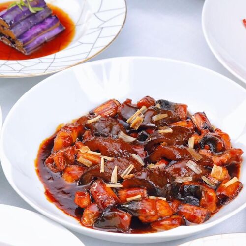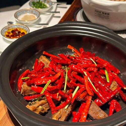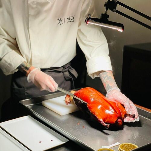 The dark green façade and warm grey room impart sophisticated taste. The jasmine centrepiece on each table exudes a pleasant scent and befits the restaurant’s name. On the menu, Beijingese melds with Shandong in refined masterpieces that look and taste divine. The signature classic Peking duck can be ordered in individual portions – in addition to pancake, scallion and cucumber, chargrilled duck breast with crispy skin is luxed up with caviar.