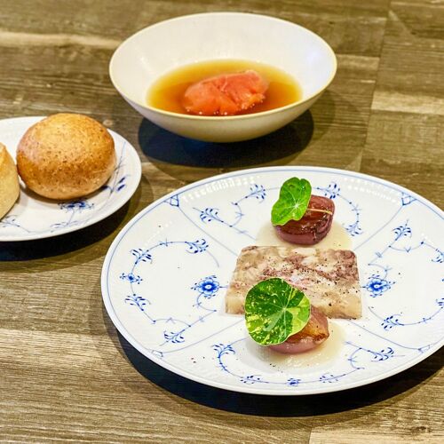 ‘Kuude’ is ‘let’s eat’ in Osaka dialect, the chef’s nickname is Kiyo, and the whole name has a French sound to it. A colour scheme of bright blue and green declares the shop’s freedom from convention. The theme is ‘unforgettable cuisine’: each dish features no more than three items, arrangements are minimal, and portions are generous. At lunchtime, set meals of Western items paired with rice and miso soup make ku:de kiyo a local favourite.