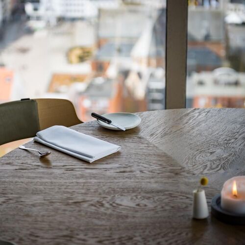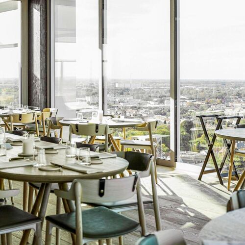 Alex Verhoeven ne ménage pas ses efforts. Vous le trouverez dans ce petit joyau industriel/scandinave/trendy, en haut de la tour Turnova. La vue sur la Campine est fabuleuse ! Il donne le premier rôle aux produits d’exception dans ses subtiles créations relevées d’inspirations originales. La carte des vins est fascinante, elle aussi !