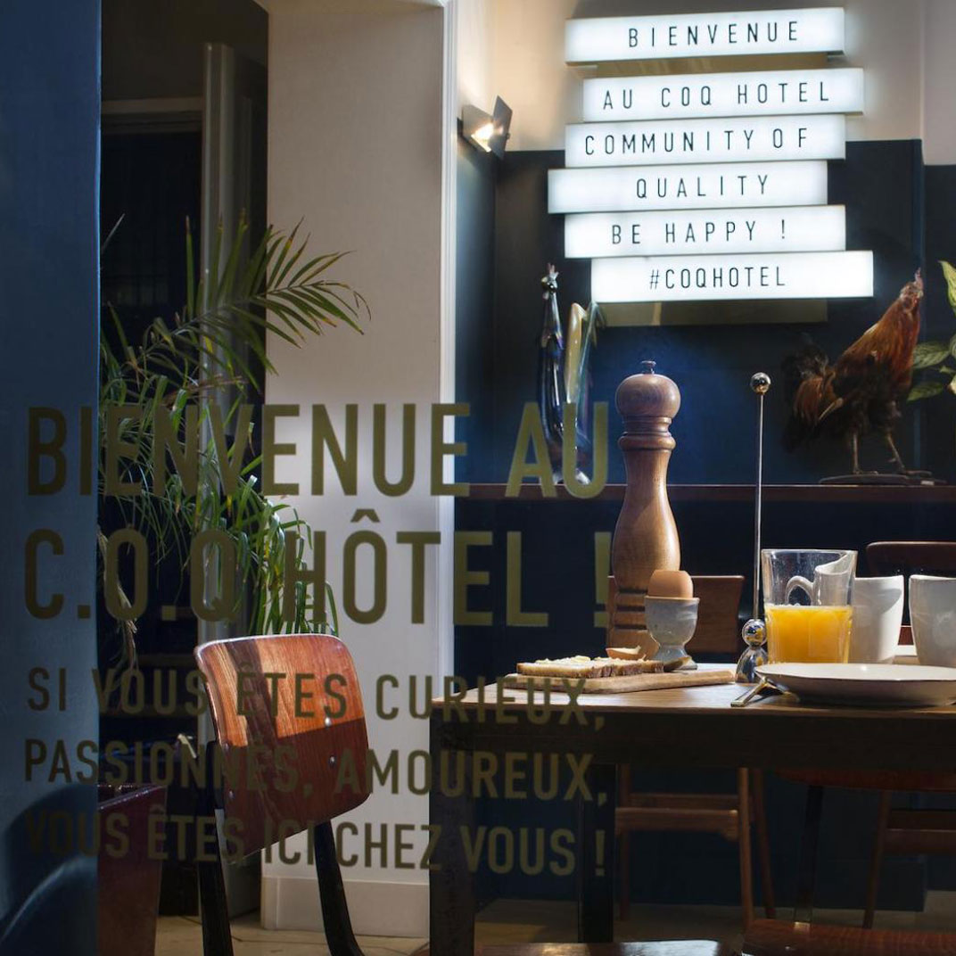 Delphine Sauvaget et Pauline d’Hoop, de l’Agence Favorite, sont bien connus pour leur travail dans des restaurants tendance, et ont reçu carte blanche pour le C.O.Q., leur premier hôtel. Le résultat, c’est un véritable hôtel de qualité finement exécuté, sans thématique fantoche ni attitude faussement « cool » , parfaitement adapté à ce coin de la rive gauche, près de la place d’Italie, quartier essentiellement résidentiel.